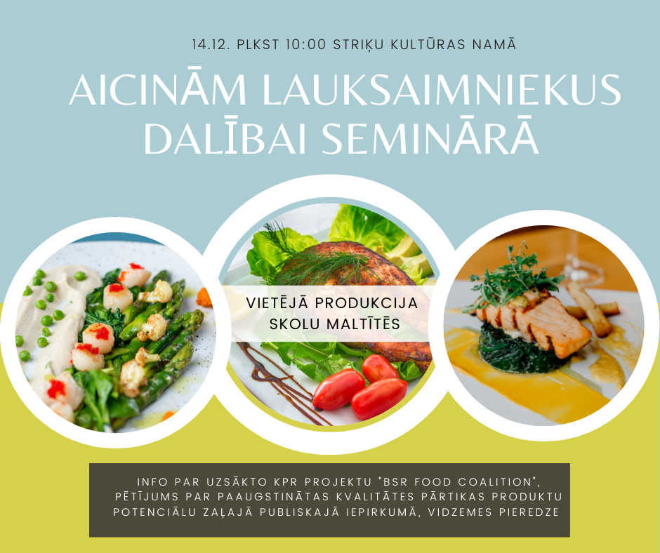 2022. gada 14. decembrī plkst. 10:00 aicinām Kurzemes lauksaimniekus uz semināru un diskusiju Striķu kultūras namā par vietējās produkcijas veicināšanu skolu maltītēs.