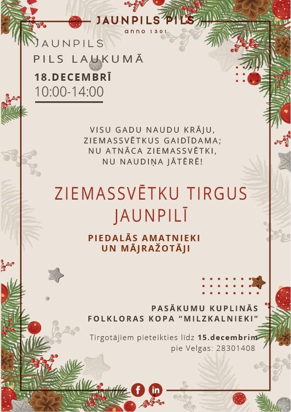 Datums: 18. Decembris, 2022Reģions: KurzemeVieta: Jaunpils Pils laukumāAdrese: Skatīt karti lielākā izmērā Nozare: UzņēmējdarbībaKontaktinformācija: T. 28301408 - VelgaPielikums: PielikumsIzmērs 316548460_620006756541768_2593238382162109287_n.jpg83.53 KB Reģions filtram: Tukuma novads