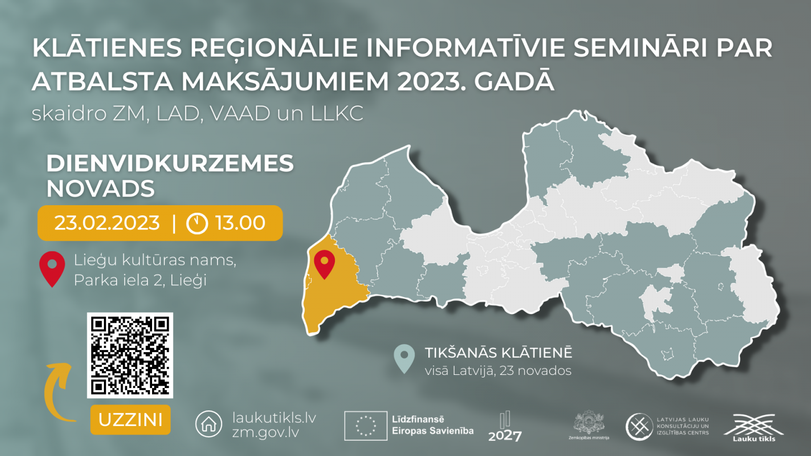 SIA “Latvijas Lauku konsultāciju un izglītības centrs” sadarbībā ar Zemkopības ministriju, Lauku atbalsta dienestu, Valsts augu aizsardzības dienestu aicina uz reģionālo semināru Dienvidkurzemes novadā par jaunajiem atbalsta maksājumiem un to saņemšanas nosacījumiem Latvijas Kopējās lauksaimniecības politikas Stratēģiskā plāna (KLP SP) ietvaros.
