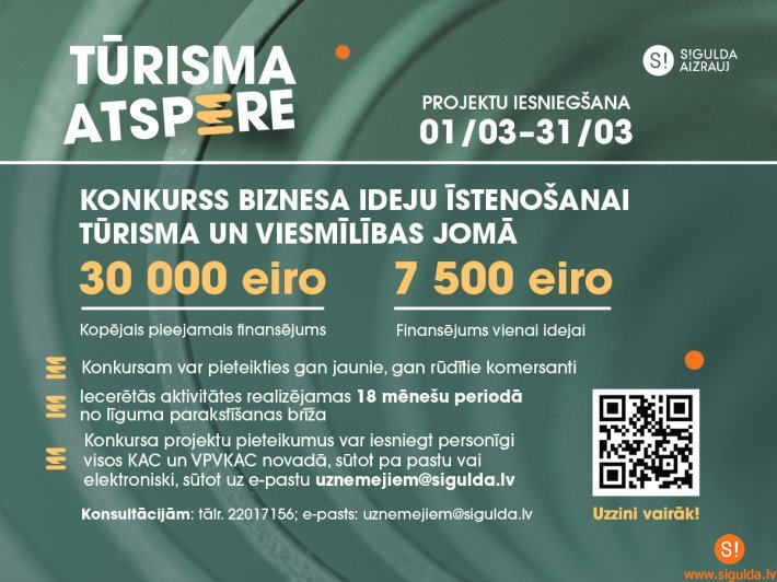 Ar saukli “Atsperies un īsteno” Siguldas novada pašvaldība izsludina konkursu “Tūrisma atspere” ar mērķi atbalstīt ekonomiski ilgtspējīgu projektu īstenošanu mazos un vidējos uzņēmumos, kas darbojas tūrisma un viesmīlības jomā, lai veicinātu Siguldas novadā plašāku un noturīgāku tūrisma un viesmīlības piedāvājumu.
