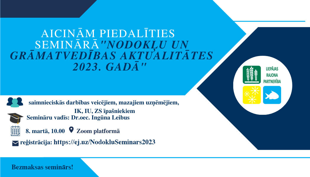 Biedrība "Liepājas rajona partnerība" piedāvā bezmaksas grāmatvedības semināru biedrības biedriem un projektu īstenotājiem (mazajiem uzņēmjiem, pašnodarbinātajiem, IK, IU, ZS īpašniekiem) – Nodokļu un grāmatvedības aktualitātes 2023. gadā.