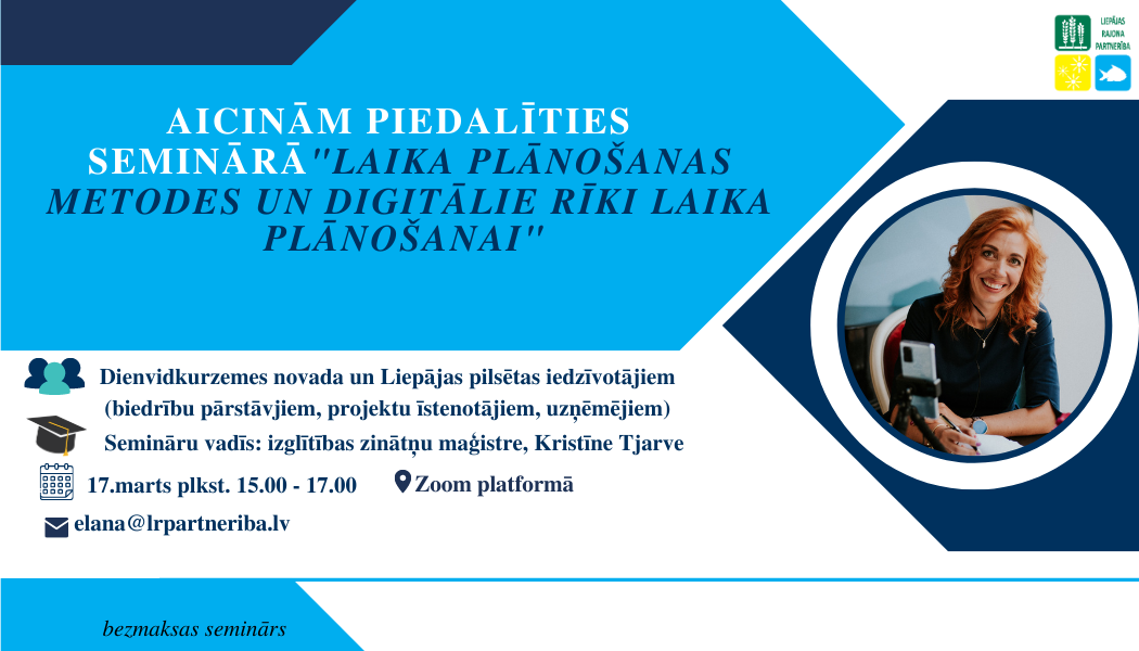 Biedrība "Liepājas rajona partnerība" aicina pieteikties bezmaksas semināram “Laika plānošanas metodes un digitālie rīki laika plānošanai” Dienvidkurzemes novada un Liepājas pilsētas iedzīvotājus – biedrību pārstāvjiem projektu īstenotājiem, uzņēmējiem.