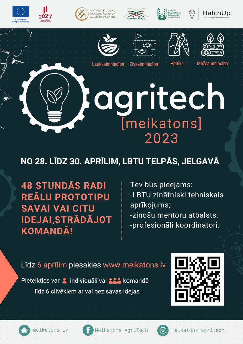 Lai veicinātu inovācijas lauksaimniecībā, mežsaimniecībā un zivsaimniecībā, arī šogad Latvijas Lauku konsultāciju un izglītības centrs (LLKC) sadarbībā ar Latvijas Biozinātņu un tehnoloģiju universitāti (LBTU) aicina piedalīties meikatonā “AgriTech 2023”, lai 48 stundu laikā radītu jaunus, dzīvotspējīgus, uz modernām tehnoloģijām un inovācijām balstītus ideju praktiskos risinājumus.