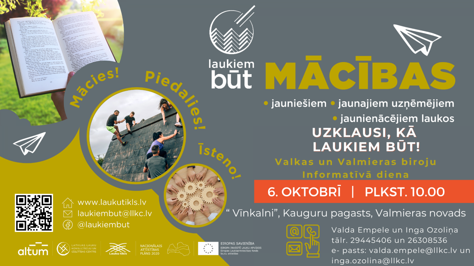 Valkas un Valmieras biroji aicina uzņēmīgus un zinātkārus jauniešus uz Kauguru pagasta "Vīnkalniem", kur 6.oktobrī pl.10.00 ar informatīvo dienu , kas vienlaicīgi notiks visosLatvijas reģionos, tiks uzsākta jau divpadsmitā “Laukiem būt!” sezona. To Latvijas Lauku konsultāciju un izglītības centrs (LLKC) īsteno aktivitātes “Atbalsts uzņēmējdarbības veicināšanai lauku teritorijās” ietvaros.