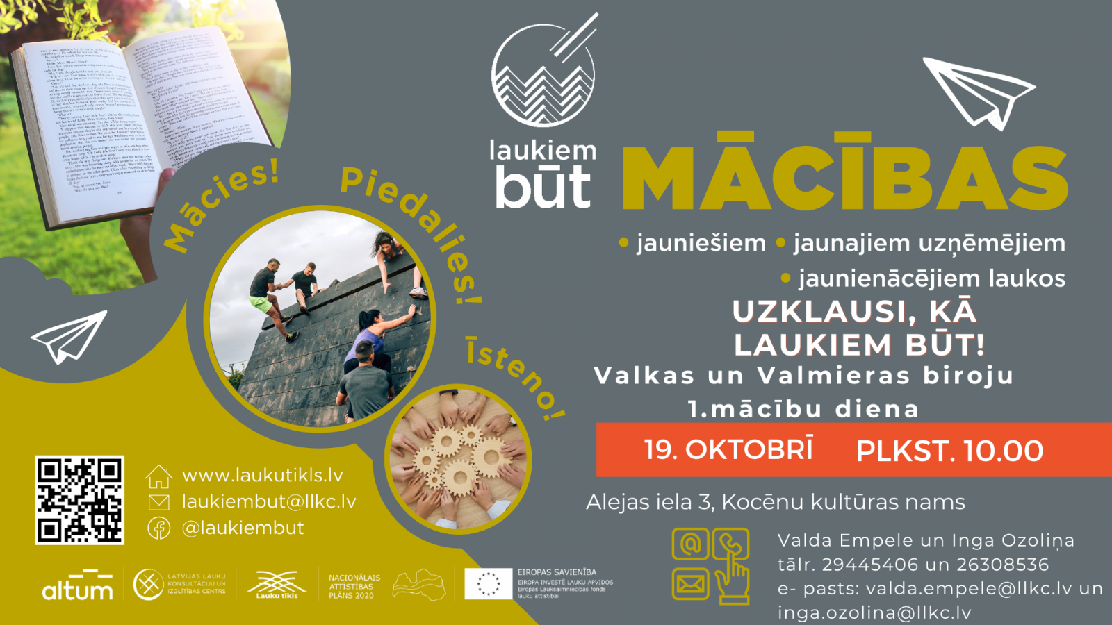19.oktobrī pl.10.00, Kocēnu kultūras namā notiks pirmā mācību diena jauniešiem pasākumā "Laukiem Būt" VKLPT aktivitātes “Atbalsts uzņēmējdarbības veicināšanai laukuteritorijās” ietvaros, ko organizē Valkas un Valmieras biroji.