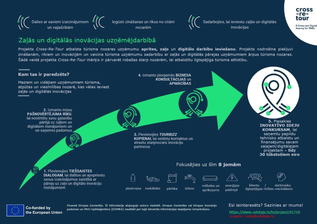 Iespēja uzlabot savu uzņēmējdarbību ES finansētā projektā Cross-Re-Tour. Projekts piedāvā atbalstu maziem un vidējiem tūrisma uzņēmumiem pārējā uz inovatīviem zaļiem un digitāliem risinājumiem. Iespēja saņemt gan tehnisku, gan finansiālu atbalstu.