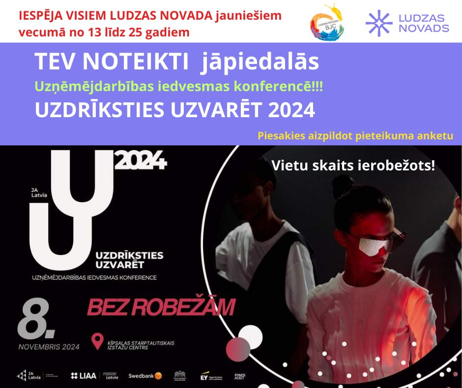 Ludzas novada jaunieši vecumā no 13 līdz 25 gadiem tiek aicināti pievienoties braucienam uz konferenci "Uzdrīksties uzvarēt". Konference notiks 8. novembrī starptautiskajā izstāžu centrā “Ķīpsala”, pulcējot gandrīz 6000 drosmīgāko un uzņēmīgāko jauniešu no visas Latvijas. Tajā ar iedvesmojošiem pieredzes stāstiem par drosmi un panākumiem biznesā un profesionālajā darbībā dalīsies spilgtākie Latvijas uzņēmēji un mākslinieki.