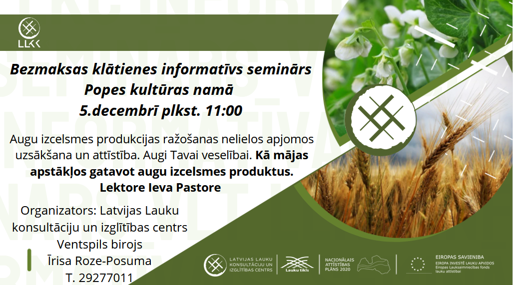 05.12.2024. | Ventspils novadā, Popes pagasta kultūras namā notiks informatīva seminārs "Augu izcelsmes produkcijas ražošanas nelielos apjomos uzsākšana un attīstība". Lektore Ieva Pastore.