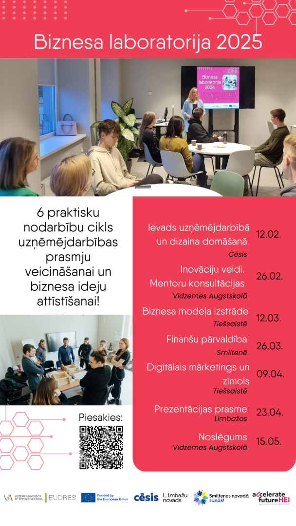 Lai sniegtu iespējas attīstīt uzņēmējdarbības prasmes un radīt jaunas idejas biznesā, Vidzemes Augstskola ar Limbažu novada pašvaldības atbalstu no 12. februāra līdz 15. maijam organizēs nodarbību ciklu “Biznesa laboratorija 2025”.
