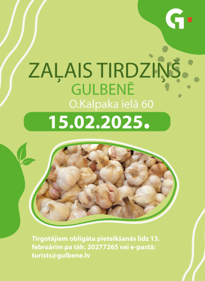 2025. gada 15. februārī 9:00 - 13:00 O.Kalpaka ielā 60, Gulbenē (pie Gulbenes novada kultūras centra un diskozālē) Zaļais tirdziņš. Tirgotājiem obligāta pieteikšanās līdz 13. februārī 17:00 pa tālr. +371 20277265 vai e-pastā: turists@gulbene.lv
