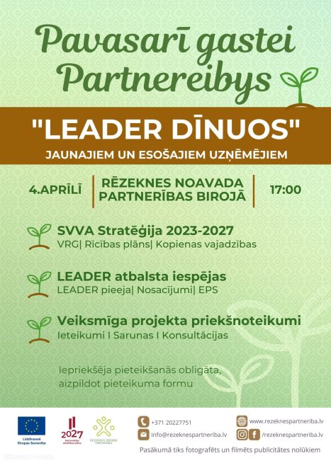 Rēzeknes novada partnerība turpina informatīvo pasākumu organizēšanu un 4. aprīlī aicina jaunos un esošos uzņēmējus “Pavasarī gasteit Partnereibys “LEADER dīnuos””.