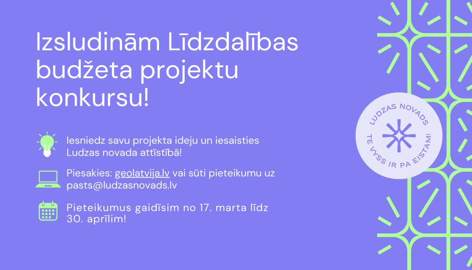 No 17. marta līdz 30. aprīlim Ludzas novada iedzīvotāji aicināti piedalīties pirmajā līdzdalības budžeta projektu konkursā, iesniedzot savas projektu idejas, tā iesaistoties novada attīstībā.