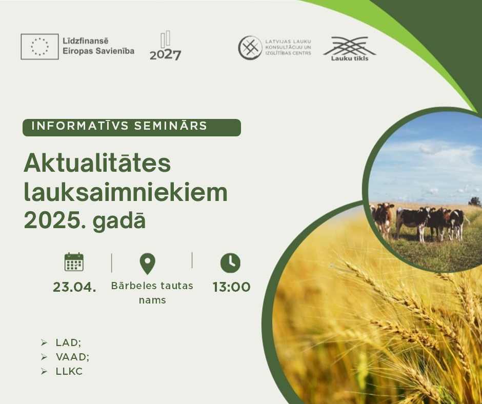 Seminārs tiek rīkots saskaņā ar Latvijas Republikas Zemkopības ministrijas un SIA „Latvijas Lauku konsultāciju un izglītības centrs”