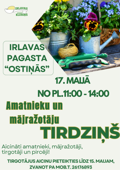 17. maijā plkst. 11.00–14.00 Irlavas pagasta “Ostiņās” amatnieku un mājražotāju tirdziņš.