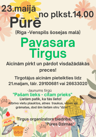 23. maijā no plkst. 14.00 Rīga - Ventspils šosejas malā notiks pavasara tirgus Pūrē.