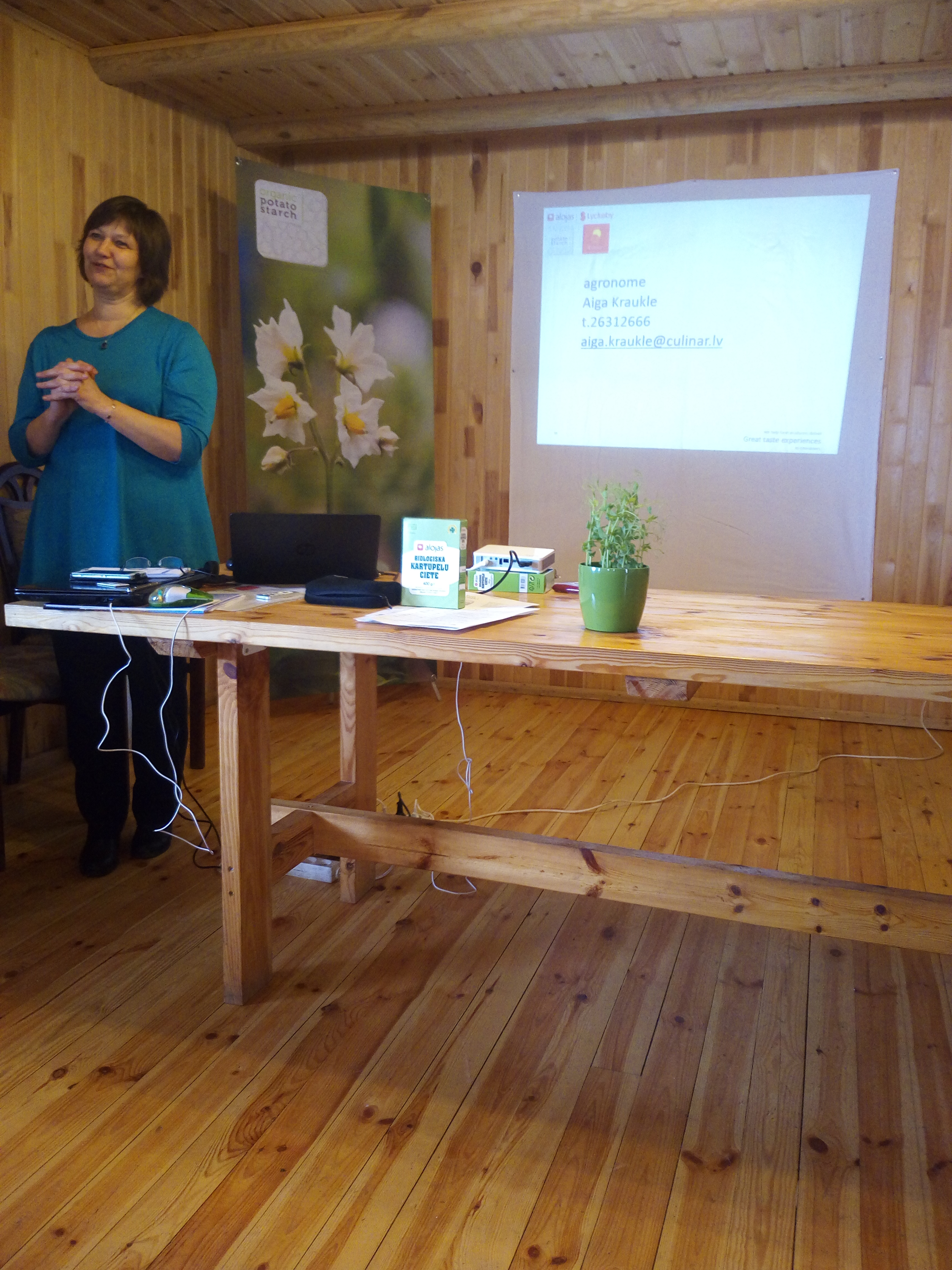 SIA “Aloja-Starkelsen” eksperte Aiga Kraukle iepazīstināja ar informāciju par kartupeļu audzēšanas līgumiem, to termiņiem un svarīgākajām izmaiņām likumdošanā. Viņa pastāstīja, kā pareizāk un efektīvāk apsaimniekot kartupeļu lauku, lai iegūtu pēc iespējas labāku kartupeļu ražu, iepazīstināja ar cietes kartupeļu šķirnēm un to īpašībām.
