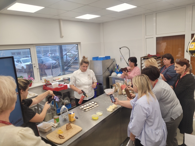 Praktisko nodarbību laikā uzņēmuma SIA “Puratos Latvia” eksperimentālajā mācību virtuvē lektoru Daces Kļavas un Lindas Bekmanes vadībā mācību dalībnieki iepazinās ar konditorejas izstrādājumu izejvielu kvalitātes novērtēšanu un piemērotību konditorejas izstrādājumu (biskvītu, kēksu, taršu) ražošanā, produktu tehnoloģisko procesu analīzi un pilnveidošanu, kā arī ar iepakojuma, dažādu izejvielu un piedevu izmantošanu izstrādājumu pievienotās vērtības radīšanā un paaugstināšanā. Tika demonstrēti dažādu veidu milti (kviešu, rudzu, miežu, auzu, rīsu, kukurūzas, zirņu, griķu, mandeļu), vairāku veidu cietes (kartupeļu, rīsu, kukurūzas), uzņēmumā ražotie konditorejas izstrādājumu pildījumi (čia-ābolu-cidoniju, ananasu, upeņu, marakujas, mango, kivi, zemeņu, citronu u. c.), ražošanas procesā izmantojamās iekārtas, ierīces, trauki, izejvielas, piedevas, materiāli.