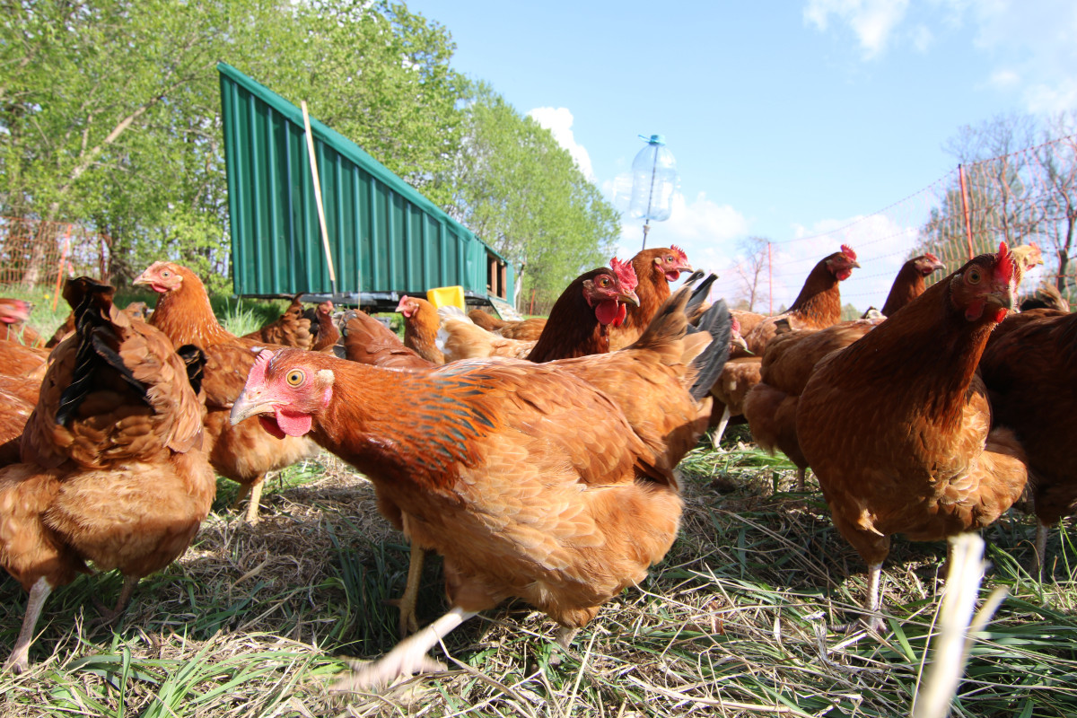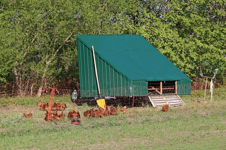 Mobilo vistu kūti Juris izgatavoja pats, ievērojot visas vistu labturības prasības. Vistu kūts ir aprīkota ar laktām, individuālajām dēšanas ligzdām, kur ir ieklāti mīksti paklājiņi, lai mazinātu olu sasišanu, vieglākai tīrīšanai un vistu komfortam, ar barotavām un vienmēr svaigu dzeramo ūdeni. Saimniecībā ir izvēlētas Leghorna šķirnes vistas, tā ir sena, populāra šķirne Latvijā. Putni gadā izdēj 280–300 olu. Šīs šķirnes vistas labi aklimatizējas, ir izturīgas un ātraudzīgas. Tā kā saimniecībā tiek audzēti dārzeņi, ar tiem tiek piebarotas arī vistas, jo īpaši profilakses nolūkos ar ķiplokiem. Izdētās olas tiek savāktas reizi dienā un līdz realizācijai tās tiek glabātas ledusskapī, realizētas 10 vai 6 olu lielās iepakojuma bretēs.