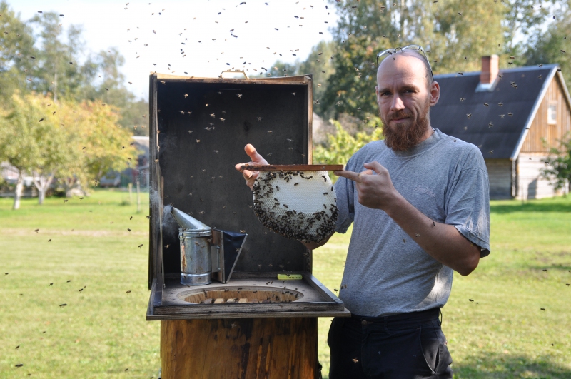 Bites nomierina – tā, apskatot savu bišu dravu, saka bitenieks Žanis Jesko. Dravā  Žanis jūtas droši un iet bez speciālā bitenieka tērpa, kas var pasargāt no bišu dzēlieniem.