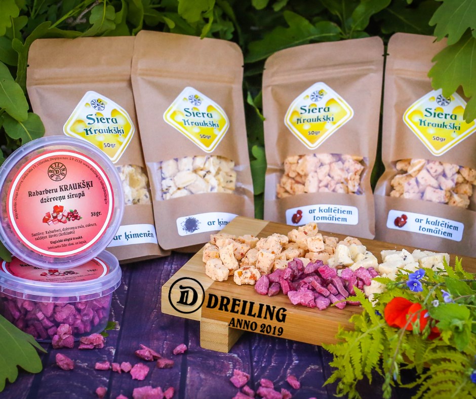Sākumā tapa mūsu jau iecienītie produkti – ķirbju, dzērveņu un rabarberu kraukšķi. Neierobežojām sevi eksperimentos, jaunas idejas produktiem nosapņojam un rīkojamies. Tā ir radušies tādi produkti kā aukstumā žāvētas gailenes, pētersīļi, ķirbju milti, siers, liofilizētas upenes, mellenes. Ļoti iecienīti ir augļu, ogu un dārzeņu mix iepakojumi. Tādā veidā pircējam ir iespēja uzreiz nogaršot dažādus kraukšķus. Gatavojam kraukšķus gan ar cukuru, gan sīrupos, gan bez cukura. Visi produkti ir piemēroti veģetāriešu un vegānu ēdienkartēm. Un visi “Dreiling” gardumi patiešām var izraisīt atkarību! Tie pārsteidz jebkuru ēdāju ar garšu un kraukšķīgumu. Pat lielākie skeptiķi ir pārsteigti, ka, piemēram, ķirbis pēkšņi var būt garšīgs.