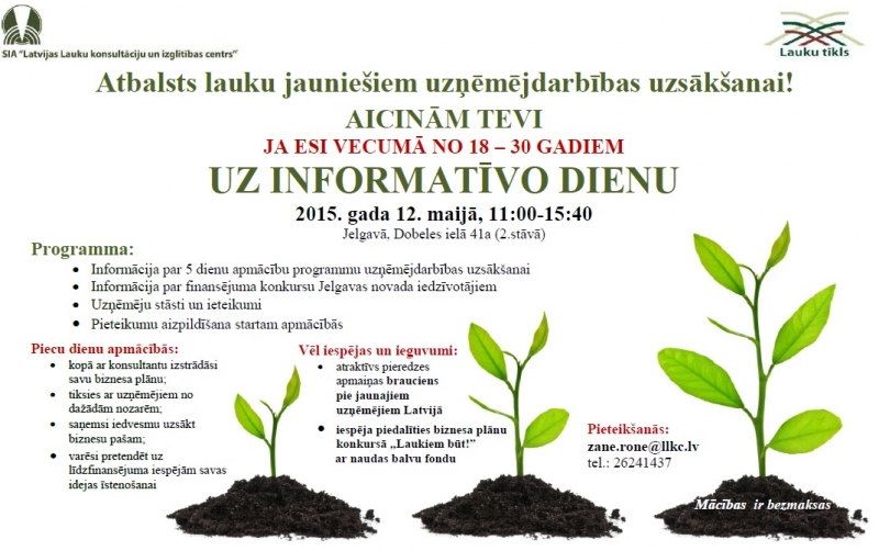 LLKC Jelgavas nodaļa jau piekto gadu organizē pasākumu „Atbalsts lauku jauniešiem uzņēmējdarbības veicināšanai”. Aicinām Tevi, ja esi vecumā no 18 līdz 30 gadiem, uz informatīvo dienu!