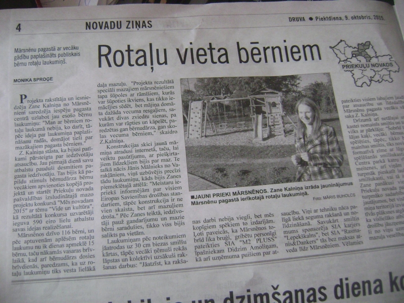 Jāpiebilst, ka Zanes ikdiena ir daudzpusīgi aktīva. Dienā īsi pirms biznesa idejas prezentācijas konkursam “Laukiem būt!” jauniete sniedza interviju reģionālajam laikrakstam “Druva” par realizēto projektu “Bērnu laukuma plašināšana” Mārsnēnos. Lai gan pašas Zanes ģimenes dzīves vieta ir vairāk nekā kilometru no izveidotā laukuma, Zane saredzēja nepieciešamību to izveidot. Projekta realizācija prasīja ne tikai izzināt bērnu laukuma drošības aspektus un tos atbilstoši īstenot, bet arī uzrunāt un piesaistīt projektam sponsorus.