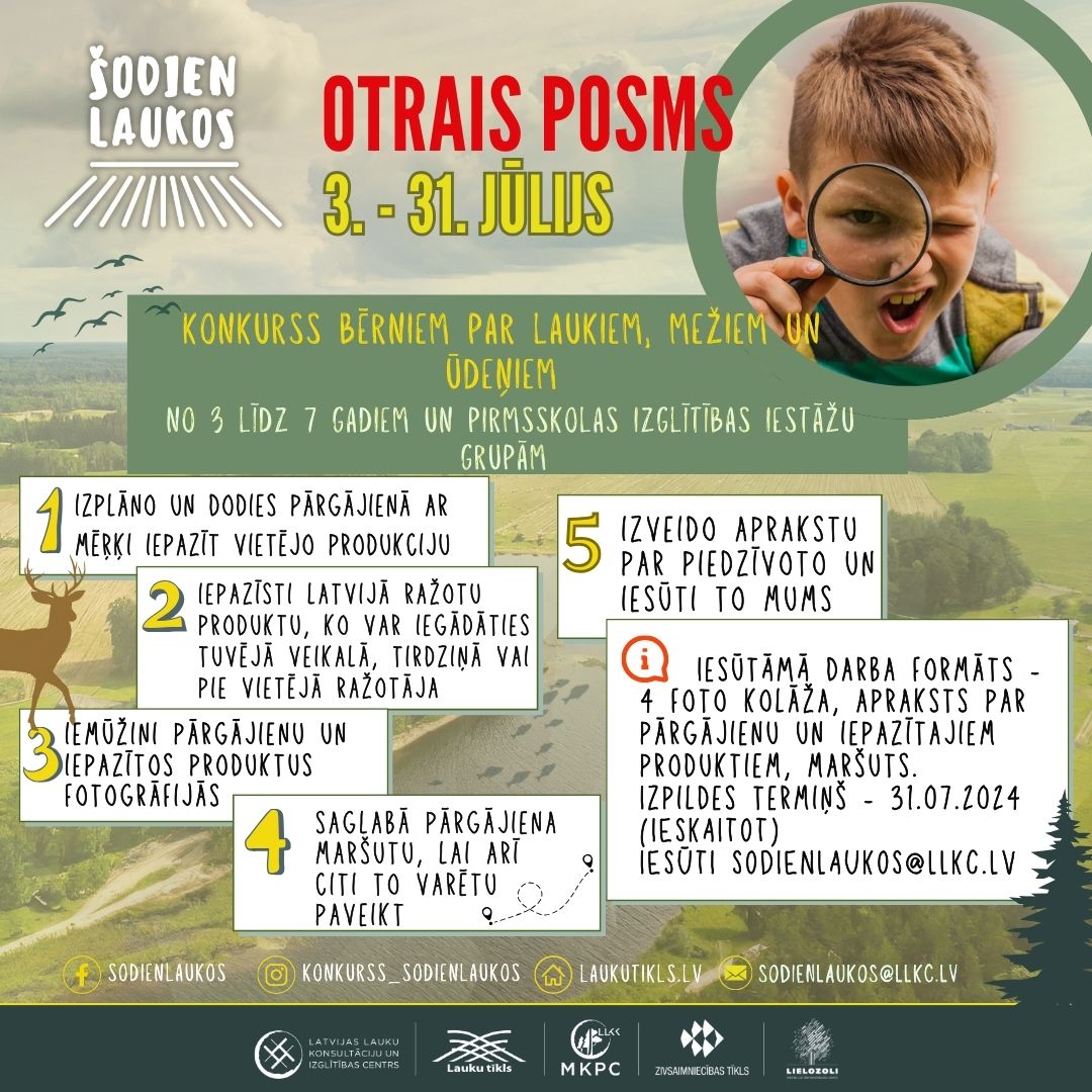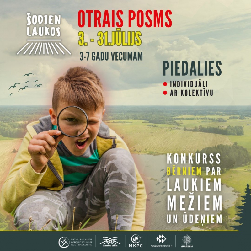 Latvijas Lauku konsultāciju un izglītības centrs jau devīto gadu organizē konkursu “Šodien laukos”. Konkursa mērķis ir pilnveidot skolēnu izpratni par lauksaimniecību, mežsaimniecību un zivsaimniecību, dodoties dabā un pildot dažādus uzdevumus. Konkursa 2. posms paredzēts bērniem vecumā no 3 līdz 7 gadiem, individuāli vai komandās, konkursa norises laiks 3. Līdz 31. jūlijs.