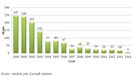 Likvidēto kooperatīvo sabiedrību skaits Latvijā 2000.–2014. gadu periodā