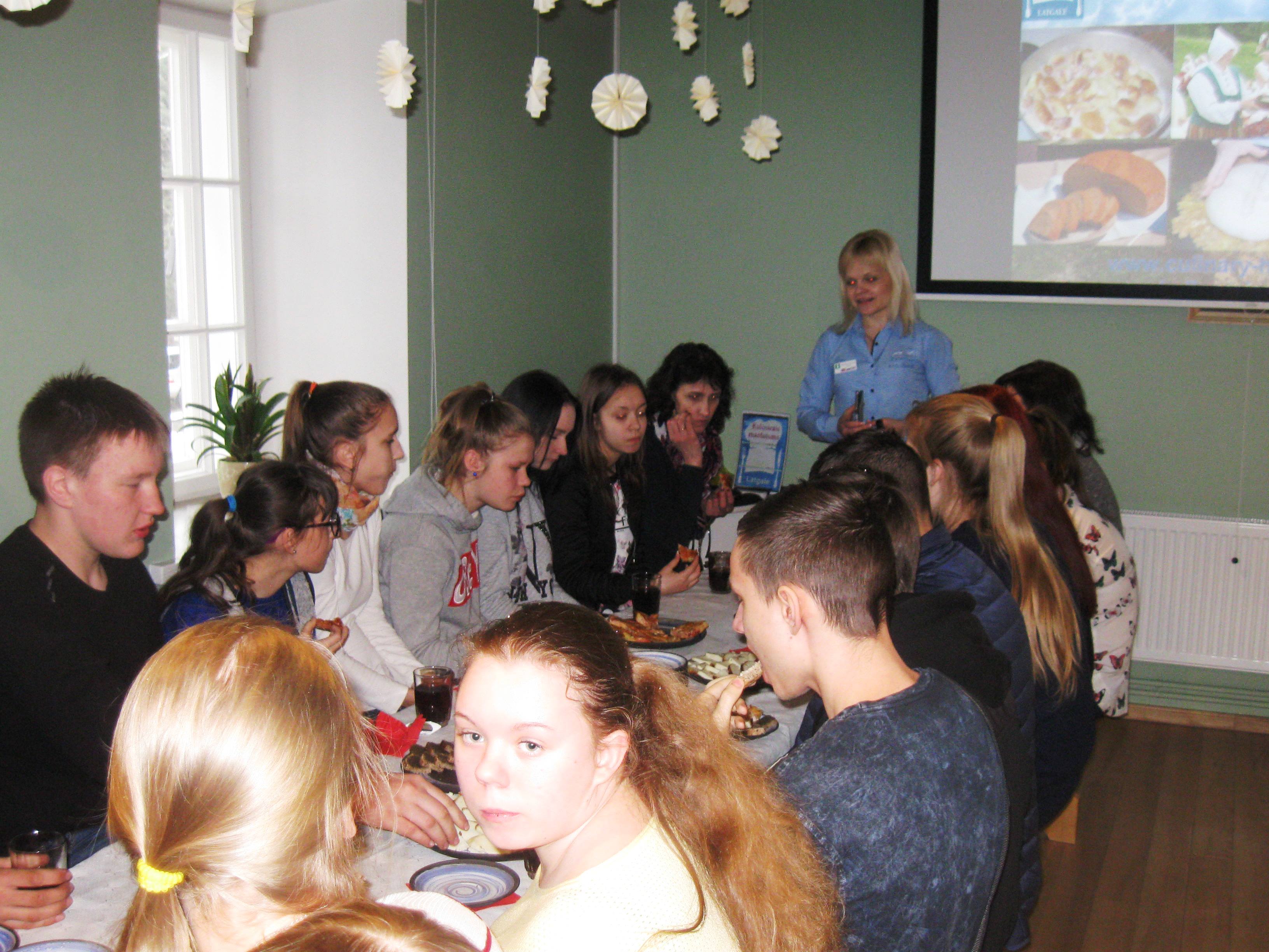 Tālāk devāmies uz biedrību “Latgales kulinārā mantojuma centrs” Krāslavā. Skolēni ieguva informāciju par biedrības darbību, mājražošanu, Latgales kulinārā mantojuma mārketinga aktivitātēm 2016. gadā, pasākumu un tirdziņu organizēšanu, pieredzes apmaiņas braucieniem, biedru dalību semināros, konferencēs un starptautiskajās izstādēs u.c. Kafijas pauzē tika baudīti labumi no “Latgales kulinārā mantojuma galda”.