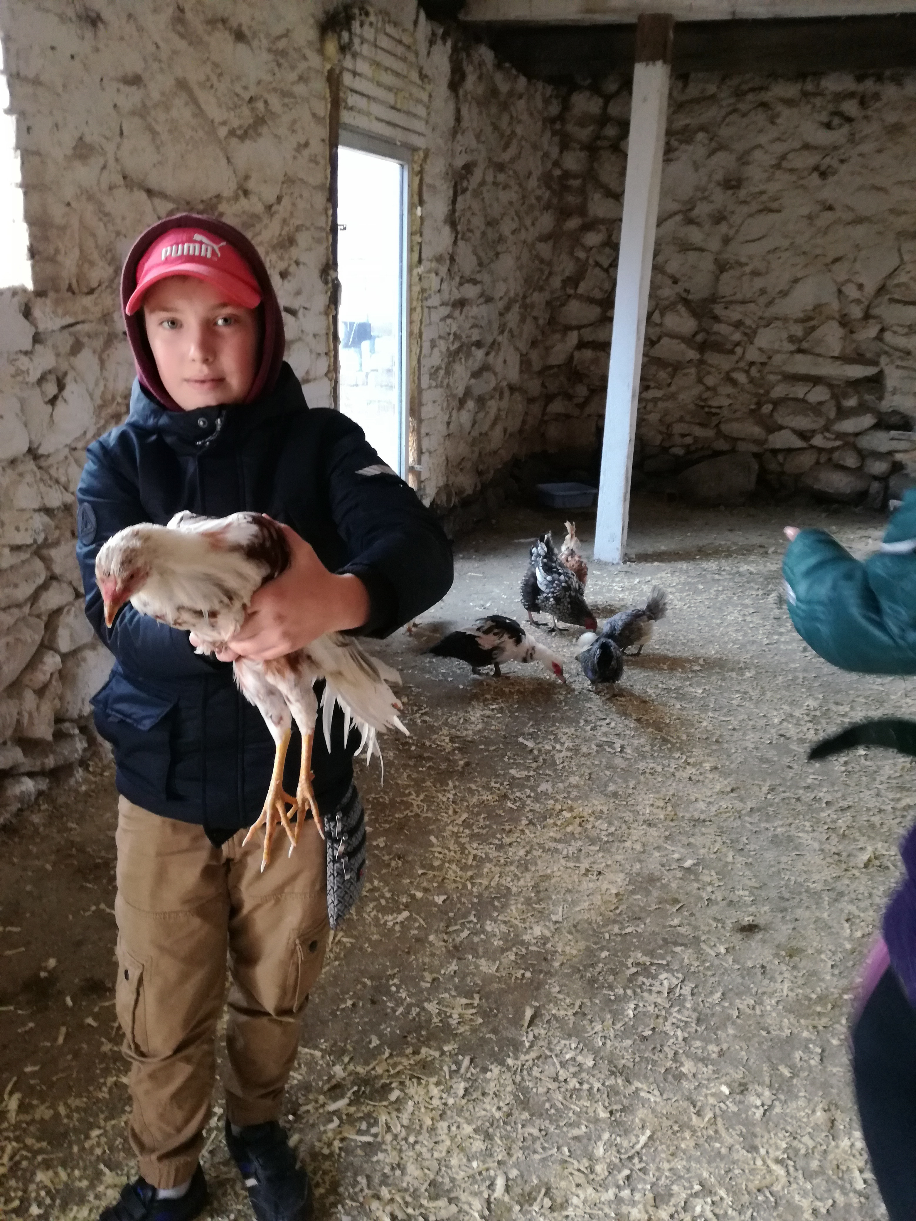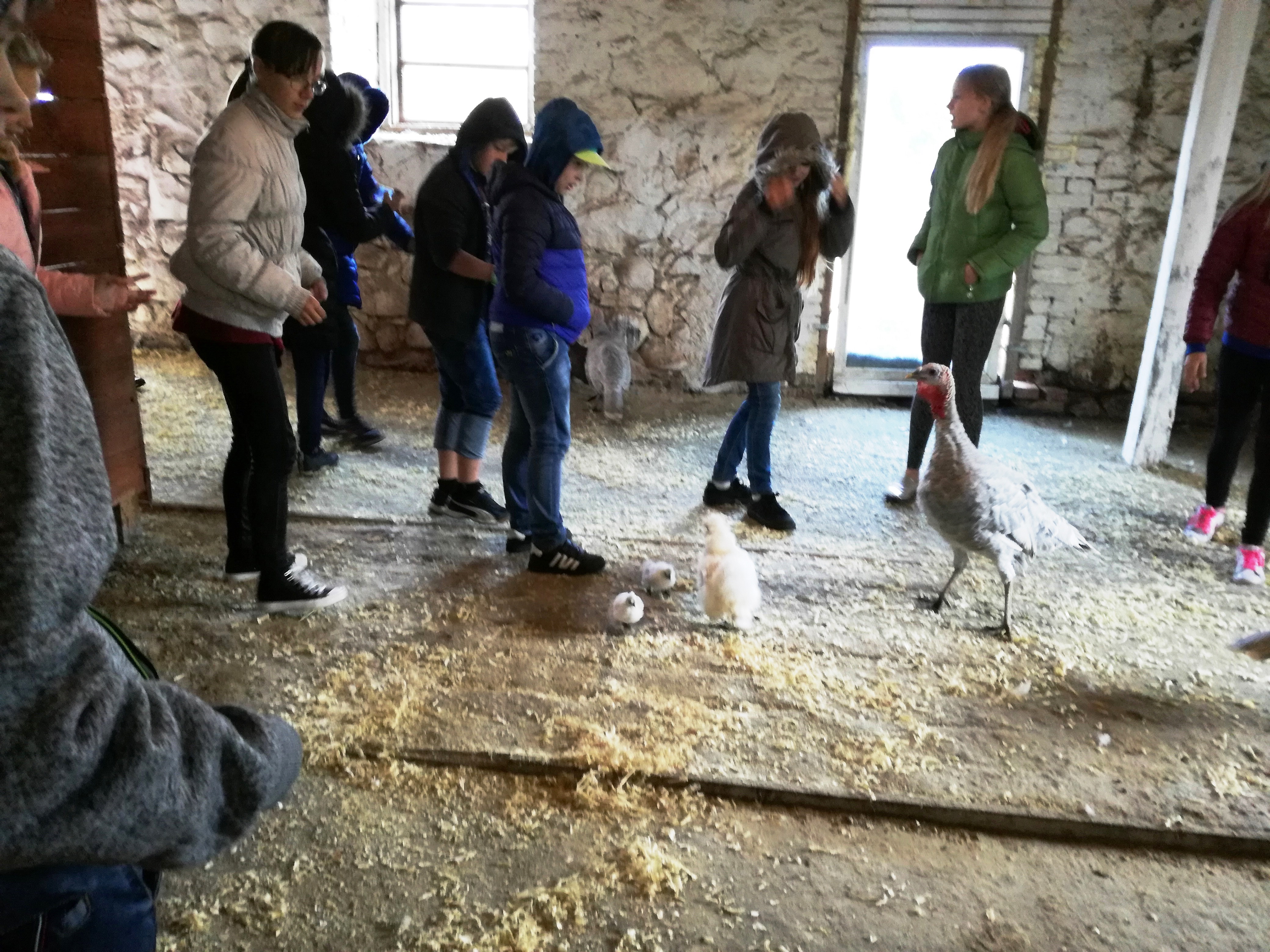 Pirmā tika apmeklēta Krustpils pagasta saimniecība „Krustpils putni”, kur mūs sagaidīja saimniecības pārstāve Zanda Bojere, viņa pārstāv arī Mīļdzīvnieku biedrību. Saimniecība dibināta pirms četriem gadiem, ir bioloģiski sertificēta. Te audzē dažādu šķirņu vistas, aitas, trušus, zirgus un ponijus. Brauciena dalībniekus vairāk interesē zirgi. Zanda parāda, kā pareizi sagatavot un apseglot zirgu. Skolēni var darboties līdzi, izskan jautājumi, daudziem šī ir pirmā tuvākā iepazīšanās ar zirgkopību. Dažiem vairāk patīk poniji, jo viņi ir ļoti draudzīgi, bērni var viņus barot, paglaudīt, nofotografēties. Saimniece pastāstīja par dažādām zirgu šķirnēm un to izmantošanu mūsdienās, par to, ka saimniecībā notiek arī apmācības jāšanā. Nesen, augusta sākumā, te notika pasākums “Svētki kopā ar zirgiem” ar daudzveidīgu programmu, tai skaitā Latvijas šķirnes zirgu parādi. Šādu pasākumu plānots organizēt arī nākamajā gadā. Noslēgumā drosmīgākie varēja izmantot iespēju un Zandas pavadībā izjāt nelielu apli.