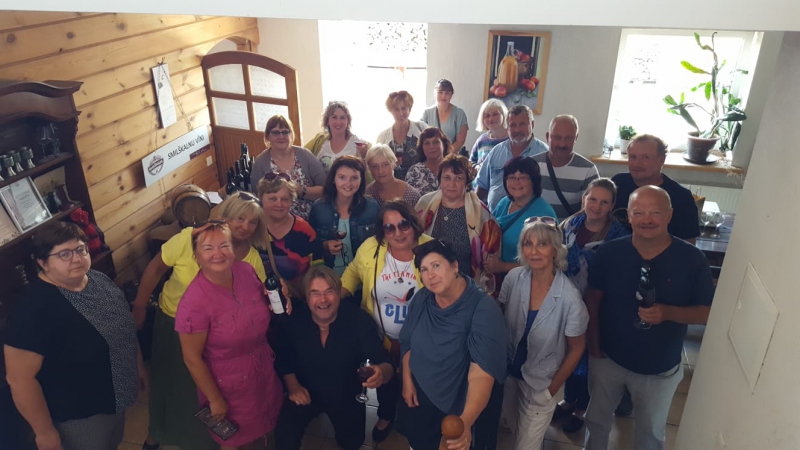 Mūsu brauciena noslēgumā apmeklējām kooperatīva “Kuldīgas labumi” biedru – zemnieku saimniecību “Smilškalni”. Jau kooperatīva veikaliņā pamanījām gaumīgi noformētos “Smilškalnu” vīnus. Saimniecībā audzē, pārdod un pārstrādā dažādas ogas – zemenes, avenes, upenes, kazenes, aronijas, smiltsērkšķus, ķiršus, brūklenes un pīlādžus. Apmeklējam saimniecības vīna darītavu un, klausoties saimnieka Alvila Elkšņa stāstījumā, par darbu un nākotnes izaicinājumiem, degustējam galdā celtos ogu un augļu vīnus.