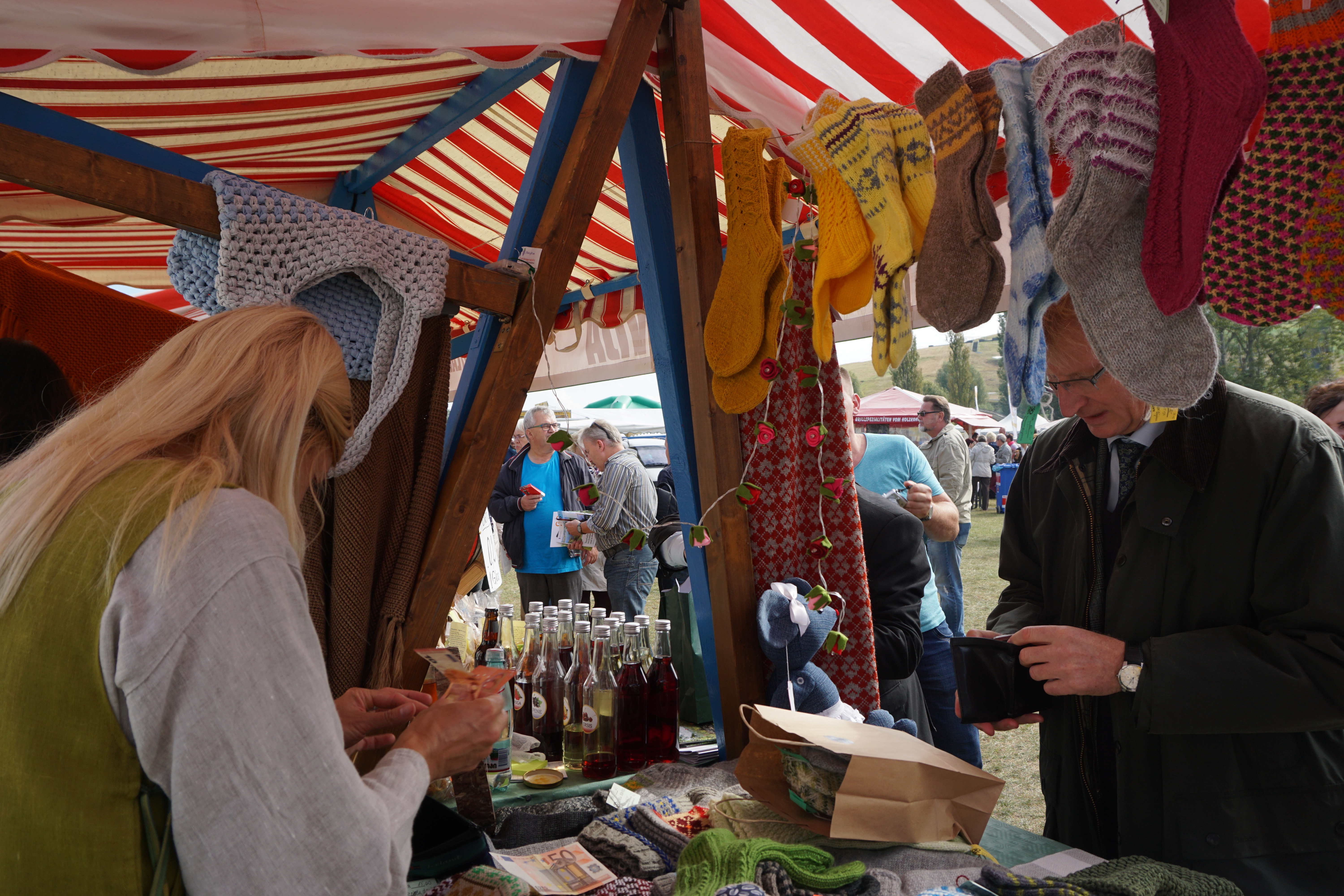 Arī šogad izstādes apmeklētājiem bija iespēja iegādāties amatnieku darinājumus. Uz izstādi aizvedām Rūjienas amatnieku biedrības „Rūzeles” dalībniešu adītās zeķes un cimdus, linu tekstīlijas, amatniecības preces bērniem. Īstais laiks, lai gādātu siltu zeķu pāri, – tā teica vācieši un pirka Rūjienas amatnieču adījumus.