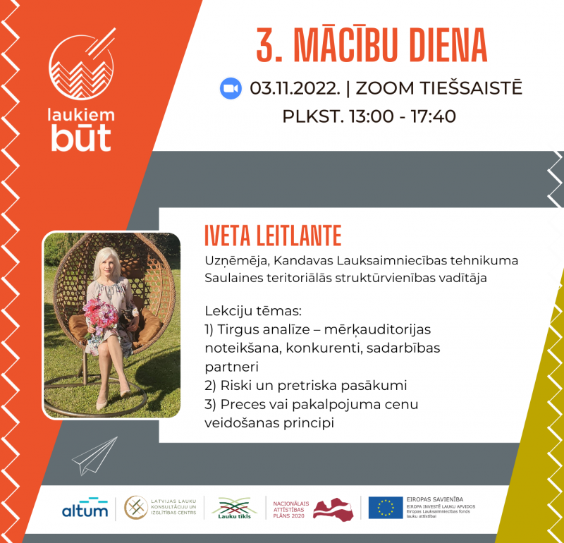 Mācību jauniešiem, jaunajiem uzņēmējiem un jaunienācējiem laukos “Laukiem būt!” 3. mācību diena par tirgus analīzi, riskiem un to vadību un par cenu veidošanu precēm un pakalpojumiem, kuru rīko LLKC Lauku attīstības nodaļa.