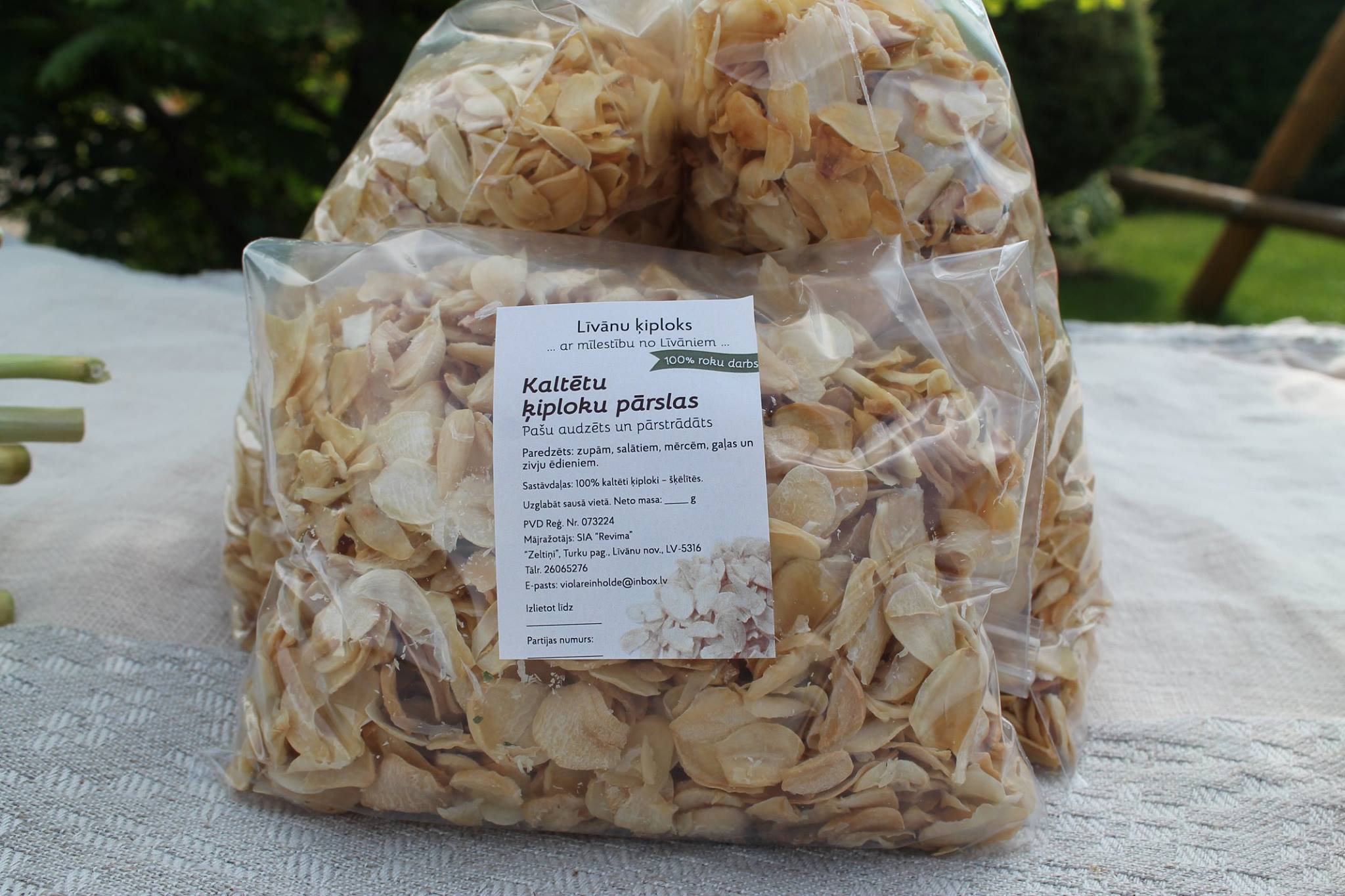 Audzējot ķiplokus, veidojas gan sakne, gan ziedi, gan lapas. Viss izaudzētais produkts ir veselīgs un uzturā lietojams, līdz ar to ir iespējams pārstrādāt pilnībā. Daļa ķiploku tiek realizēti kā sakņaugi svaigā veidā. Šogad tika sasietas apmēram 3000 ķiploku buntītes, kuras jau ir realizētas. Brāķētie ķiploki tiek malti vai pārstrādāti sīrupā. Saimniece atzīst, jo ilgāk darbojoties ar šo produktu, jo plašāks redzējums rodas, kā to var izmantot. No ziediem tiek gatavota ķiploku ziedu pasta ar dažādiem garšaugiem (dillēm, pētersīļiem, majorānu, raudeni jeb oregano, upenēm, piparmētru un ķiršiem), kaltētas ķiploku pārslas, ķiploku sīrups, ķiploku sāls un malti ķiploki. Ķiploku ziedu pasta tiek izmantota pat cepumu gatavošanā, kas šobrīd ir tikai sākuma stadijā, eksperimentējot un novērtējot, tiek meklēta īstā cepumu receptūra. Saimniece izmēģina daudz ko jaunu un šogad radās ideja par ķiploku lapu pārstrādi. Lai šajā sezonā ideja tiktu īstenota, pietrūka laika un redzējuma. Tomēr ideja nekur nav pazudusi un, iespējams, jau nākamajā sezonā būs pieejams jauns produkts.