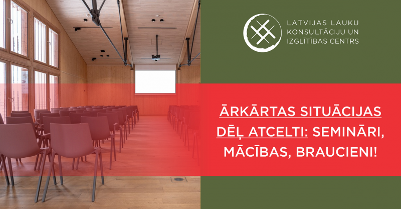 Sakarā ar izsludināto ārkārtas situāciju valstī Covid-19 vīrusa dēļ, LLKC līdz 14. aprīlim atceļ visus plānotos seminārus, mācības, braucienus. LLKC centrālajā birojā un visos konsultāciju birojos iespēju robežās tiek ierobežota apmeklētāju pieņemšana, saziņai izmantojot telefonu un e-vidi. Jautājumu gadījumā sazinieties ar sev tuvāko konsultāciju biroju vai LLKC centru: http://new.llkc.lv/lv/biroji. Izmaiņām sekojiet līdzi LLKC mājaslapā un sociālajos tīkos.