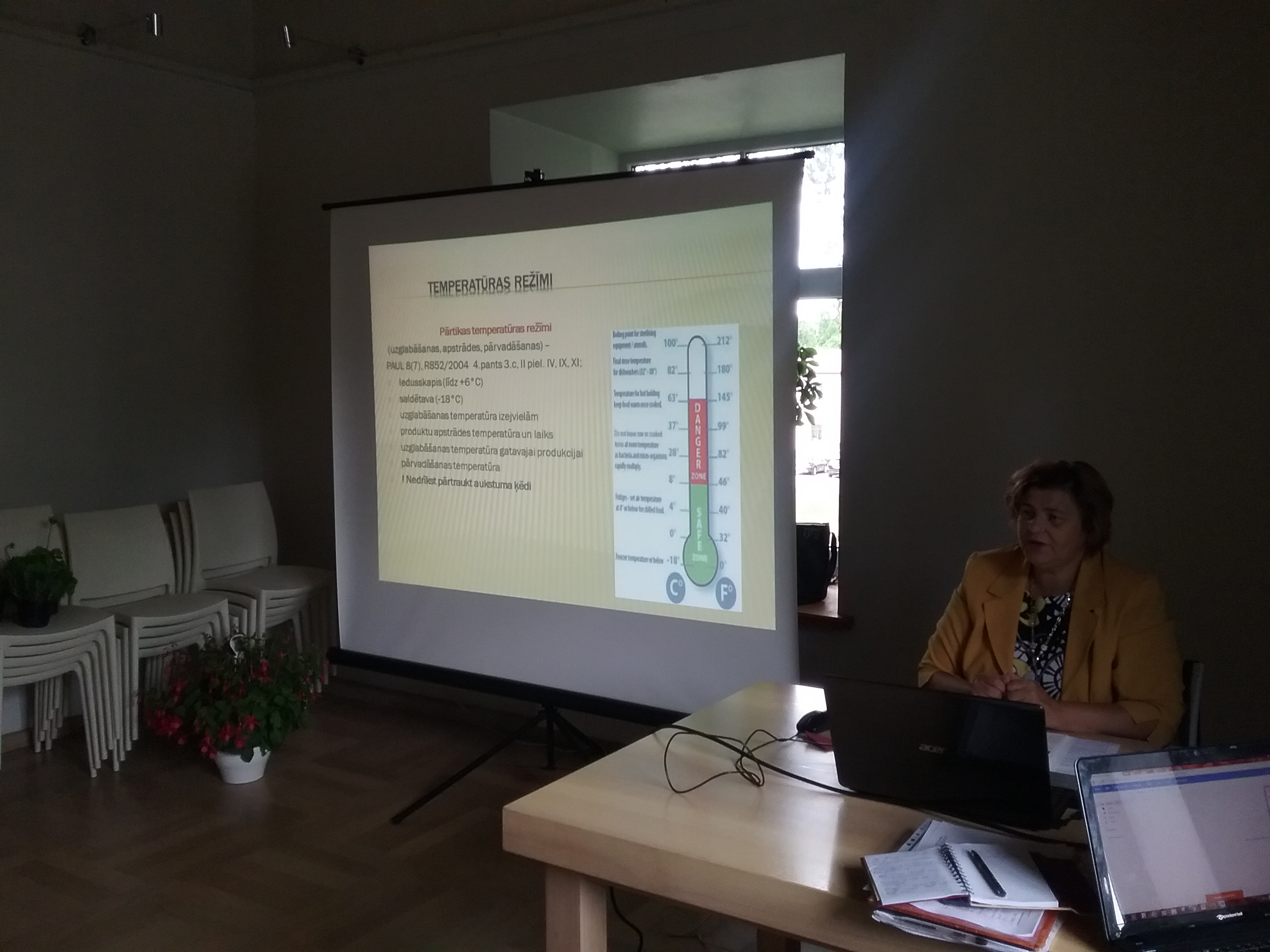 Semināra pirmā daļa tika veltīta tēmai par normatīvo aktu prasībām, kuras ražotājiem jāievēro un kuru ievērošanu kontrolē Pārtikas un veterinārais dienests. Lektore Modrīte Zieda-Ziediņa (biedrības “Vides kvalitāte” lauksaimniecības inspektore) sniedza atbildes uz daudziem aktuāliem jautājumiem gan par ražošanu, augu un dzīvnieku izcelsmes produktu pārstrādi, derīguma termiņiem, iepakojumu un preču marķēšanu, gan par reģistrāciju un vispārējiem nosacījumiem likumdošanā. Esošajiem mājražotājiem šī bija lieliska iespēja uzzināt jaunumus, izmaiņas un “atsvaidzināt” savas zināšanas, bet topošajiem ražotājiem šī bija ļoti svarīga mācību diena, jo tik laba iespēja dzirdēt visu svarīgo informāciju vienkopus nerodas bieži. Dalībniece Guna no Rīgas atzina, ka seminārā sniegtās zināšanas ir daudzpusīgas un ļoti noderīgas, uzsākot darbību.