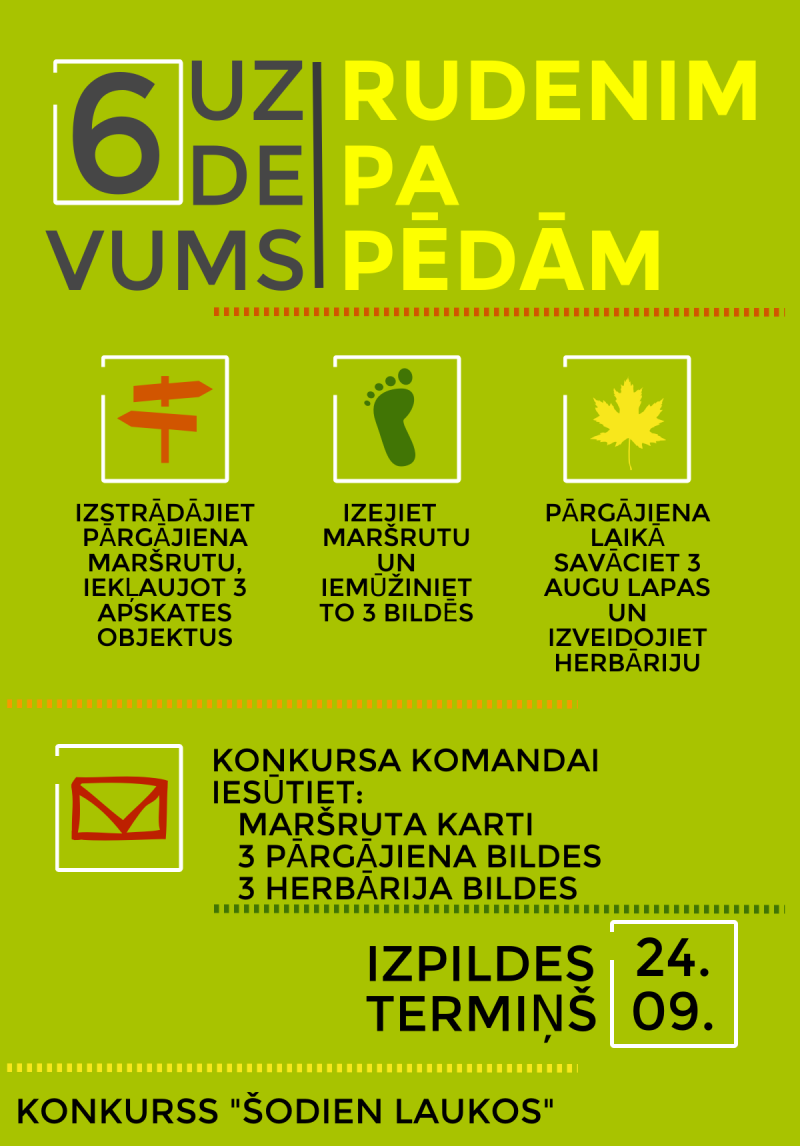 Lai raitāk iesāktos mācību gads un pēc vasaras lēnā ritma mums būtu vieglāk iejusties jaunajā darba cēlienā, 6. uzdevums ieplānots aktīvs un izzinošs. Šī mēneša lielā tēma ir “Rudenim pa pēdām”, un lielais konkursa uzdevums – izplānot pārgājiena maršrutu, kurā iekļauti vismaz 3 apskates objekti, izstaigāt šo maršrutu un tā laikā ievākt 3 augus savam herbārijam, kā arī nofotografēt savas gaitas, dodoties dabā.