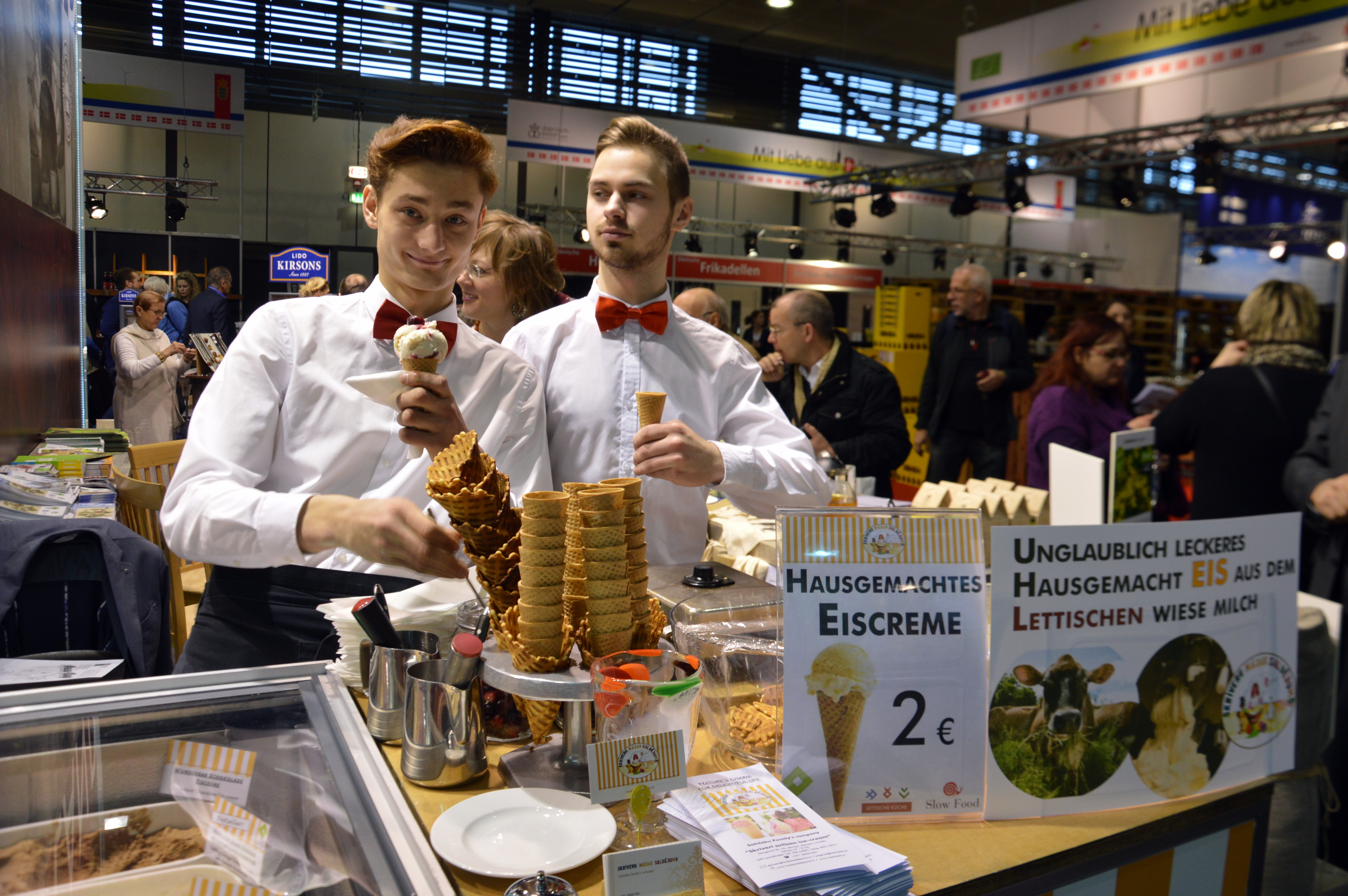 Aplūkojot Latvijas piedāvājumu, jāsecina, ka neesam vairs pirmziemnieki,– mākam gan savas prasmes parādīt, ko lieliski paveica Latvijas Etnogrāfiskā muzeja meistari, gan ar asociācijas “Lauku ceļotājs” gādību savu zemi pareklamēt, gan dažnedažādus lauku labumus piedāvāt un notirgot. Par to, lai stendā viss būtu izsmalcinātajiem vācu un arī citu valstu patērētājiem pa prātam, ar Zemkopības ministrijas atbalstu gādāja Agroresursu un ekonomikas institūts (AREI) un Latvijas Lauku konsultāciju un izglītības centrs (LLKC). Tā kā izmēģināt sava produkta noietu izstādē vēlējās gana daudz jauno uzņēmumu un mājražotāju, tad daļa no tiem tika sadalīti divās daļās, – ļaujot piedalīties pirmās piecas dienas vieniem un otras piecas – nākamajiem. Pirmās piecas dienas stendā ar saviem labumiem bija uzņēmumi “Raiskumietis”, “Snigol”, “Oga Honey Powder””, “Brīvais mustangs”, “Vladas SP”, “Baltic wild”, “55 mārītes”, “Kalnu medus”. Otrās piecas dienas – “Sula” jeb “Libertu”, “Jāņkalni”, “Kurzemnieku ražojumi”, “Skrīveru pārtikas kombināts”, “IR. Avots”, “Dienvidi plus”. Vēl virkne citu uzņēmumu savus ražojumus bija atvēlējuši tirgošanai AREI un LLKC speciālistiem.