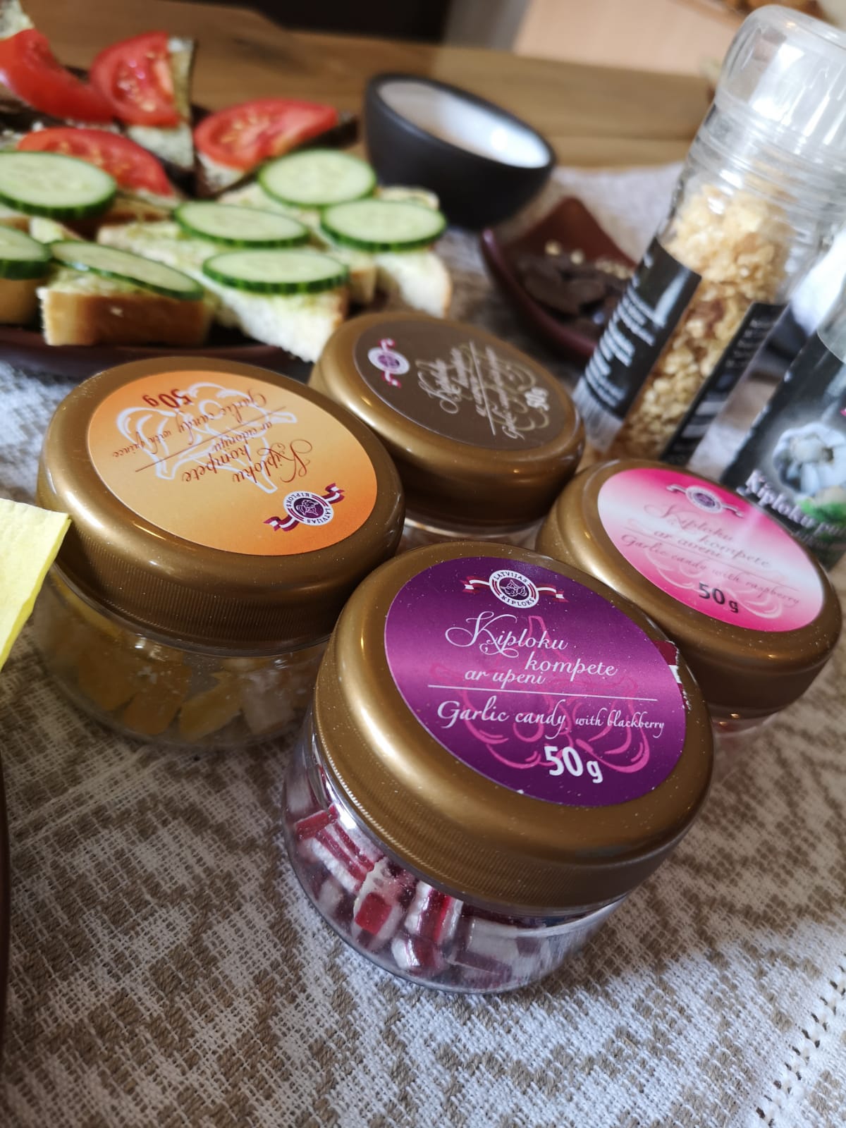 Tālāk devāmies uz Raunu, uz SIA “Latvijas ķiploks”, lai uzzinātu ne tikai par ķiploku audzēšanas metodēm, bet arī to daudzveidīgajām pārstrādes iespējām. Pie uzņēmuma īpašniecēm Sintijas Rudes un Ineses Krūklītes jau bijām viesojušies vairākkārt, taču katru reizi uzzinām ko jaunu, jo uzņēmuma īpašnieces ir patstāvīgā attīstībā un izstrādā jaunus produktus. Viņas uzskata, ka tā ir nepieciešamība mazā pilsētā, lai piesaistītu tūristus. SIA “Latvijas ķiploks” audzē ķiplokus 2 ha platībā, pārējos ķiplokus iepērk no bioloģiskajām saimniecībām Latvijā, jo kvalitāte ir ļoti svarīga uzņēmuma vērtība. Ir bijuši gadījumi, kad uzņēmējām mēģināts pārdot sliktas kvalitātes ķiplokus, tādēļ daivas tiek rūpīgi pārbaudītas – iztaustītas, izsmaržotas un pagaršotas!Atšķirībā no iepriekšējās saimniecības šķirni ‘Ļubaša’ neaudzē, jo tā neder ķiploku pārstrādei – produkti sanāk pārāk stipri. Senās latviešu šķirnes jeb kā Sintija Rude saka “omīšu” šķirnes esot pašas labākās, jo tās pielāgojušās mūsu klimatam un zemei.
