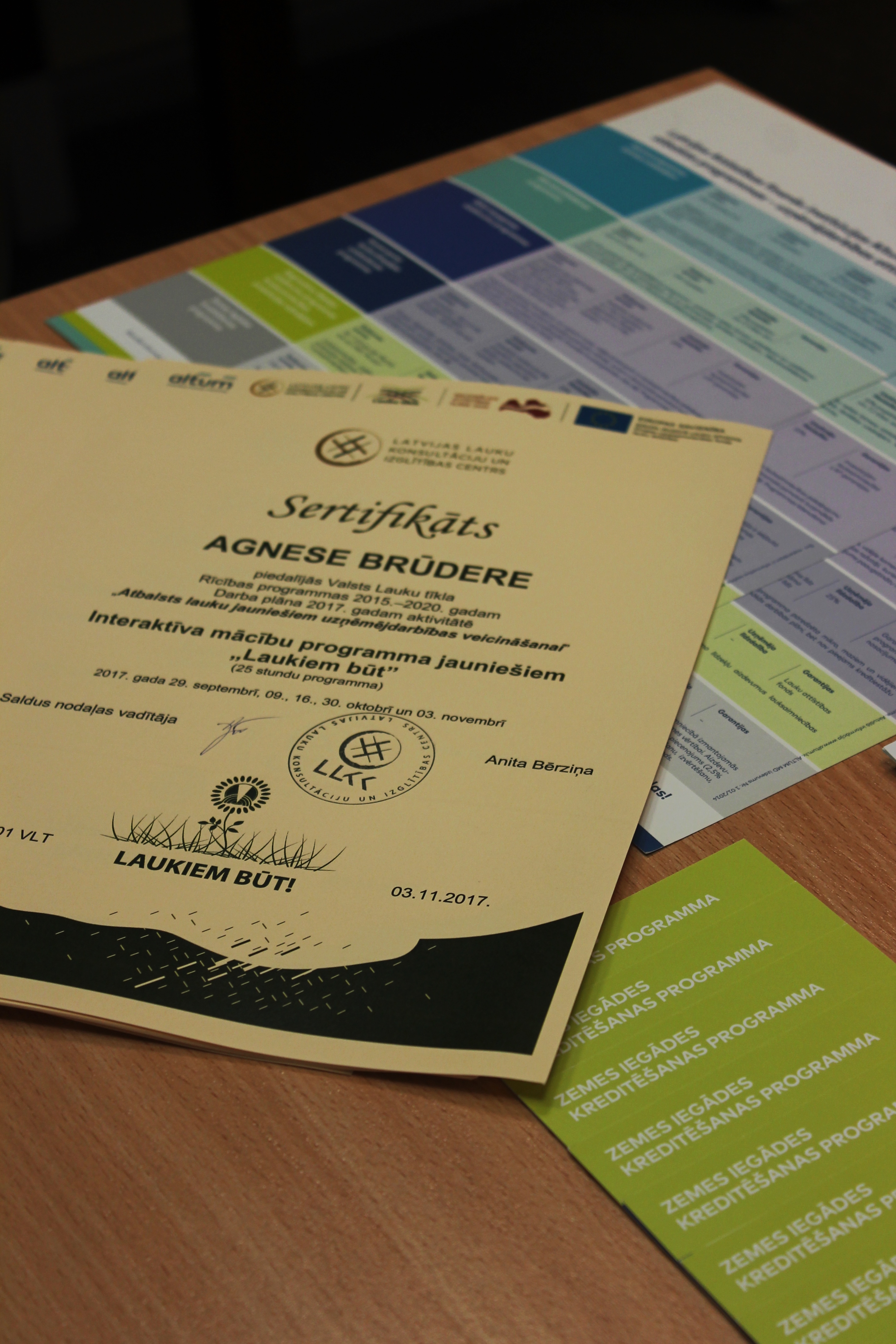 Jauniešiem noslēdzies kopīgs un aktīvs mācību periods. LLKC Saldus biroja vadītāja dalībniekiem pasniedza sertifikātus un aicināja pilnveidot savus biznesa plānus, lai varētu veiksmīgi startēt konkursā “Laukiem būt!”.