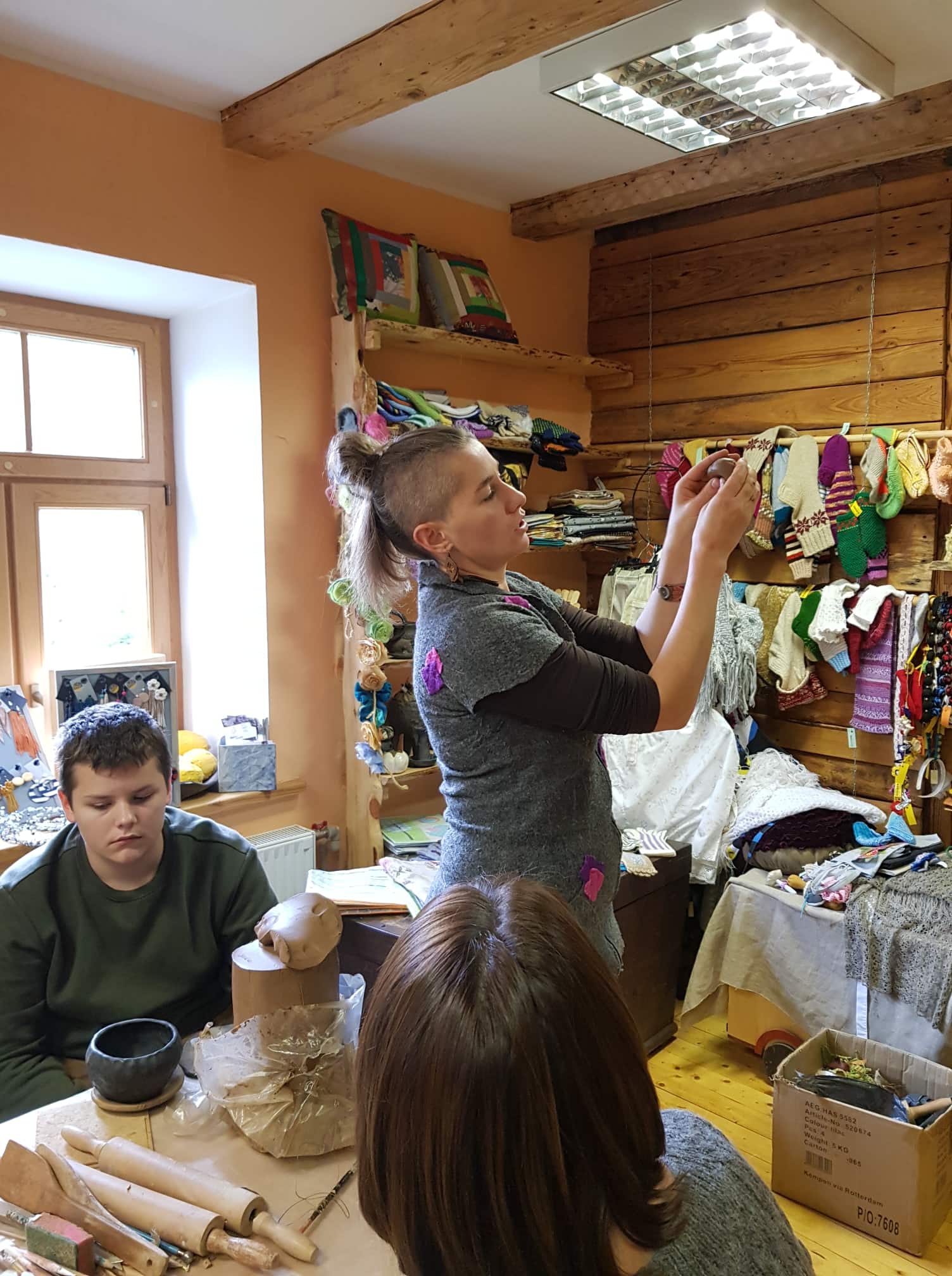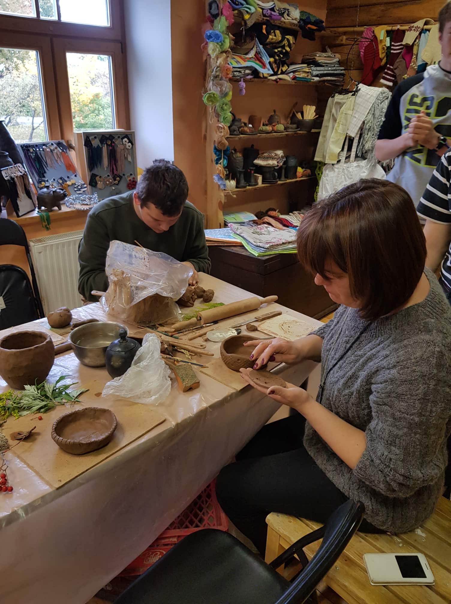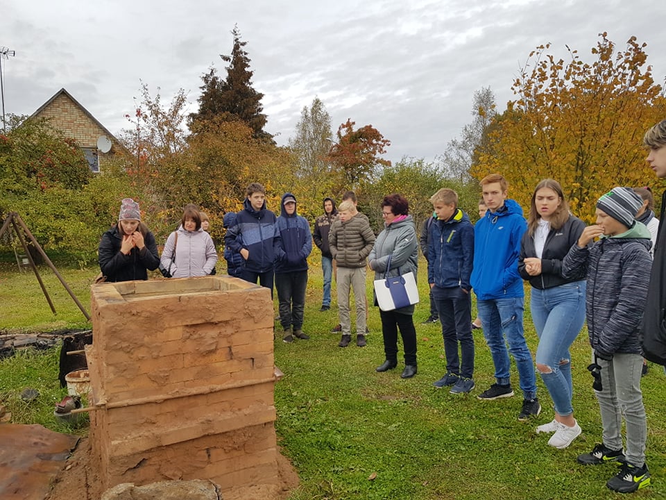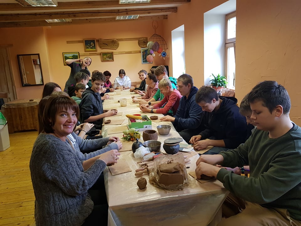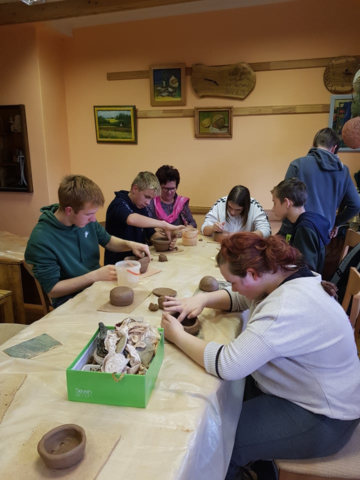 Tālāk devāmies uz Kandavas amatniecības centru, kur Linda jau ļāva darboties mums pašiem. Ievadā viņa pastāstīja par dažādajiem māla veidiem un darbības tehnikām. Pēc tam katram tika iedota māla piciņa, no kuras bija ļoti rūpīgi jāizveido maza bļodiņa. Savukārt turpinājumā bija iespēja trauciņu palielināt, liekot uz tā malām māla “desiņas” un rūpīgi tās savienojot ar apakšā izveidoto bļodiņu. Bija iespēja gatavot gan bļodiņu, gan krūzīti, pievienojot osiņu. Māla darbus dekorējām ar mežģīņu un augu nospiedumiem tajos. Ikviens skolēns aktīvi un rūpīgi attiecās pret savu darbiņu. Lai būtu droši, ka saņemsim savus trauciņus veselus, svarīgi bija tos ar pirkstiem neizspaidīt par plānu un lūkot, vai nav iemetušies gaisa burbuļi, jo tie ceplī varot sprāgt un sabojāt ne tikai vienu darbu, bet pat vairākus. Gatavus traukus gan saņemsim tikai oktobra beigās, jo tiem ir jānožūst un vēl jādodas ceplī. Savukārt Lindai ir jādomā, kā cepli piepildīt, jo vienā reizē varot ielikt pat līdz 300 priekšmetiem.