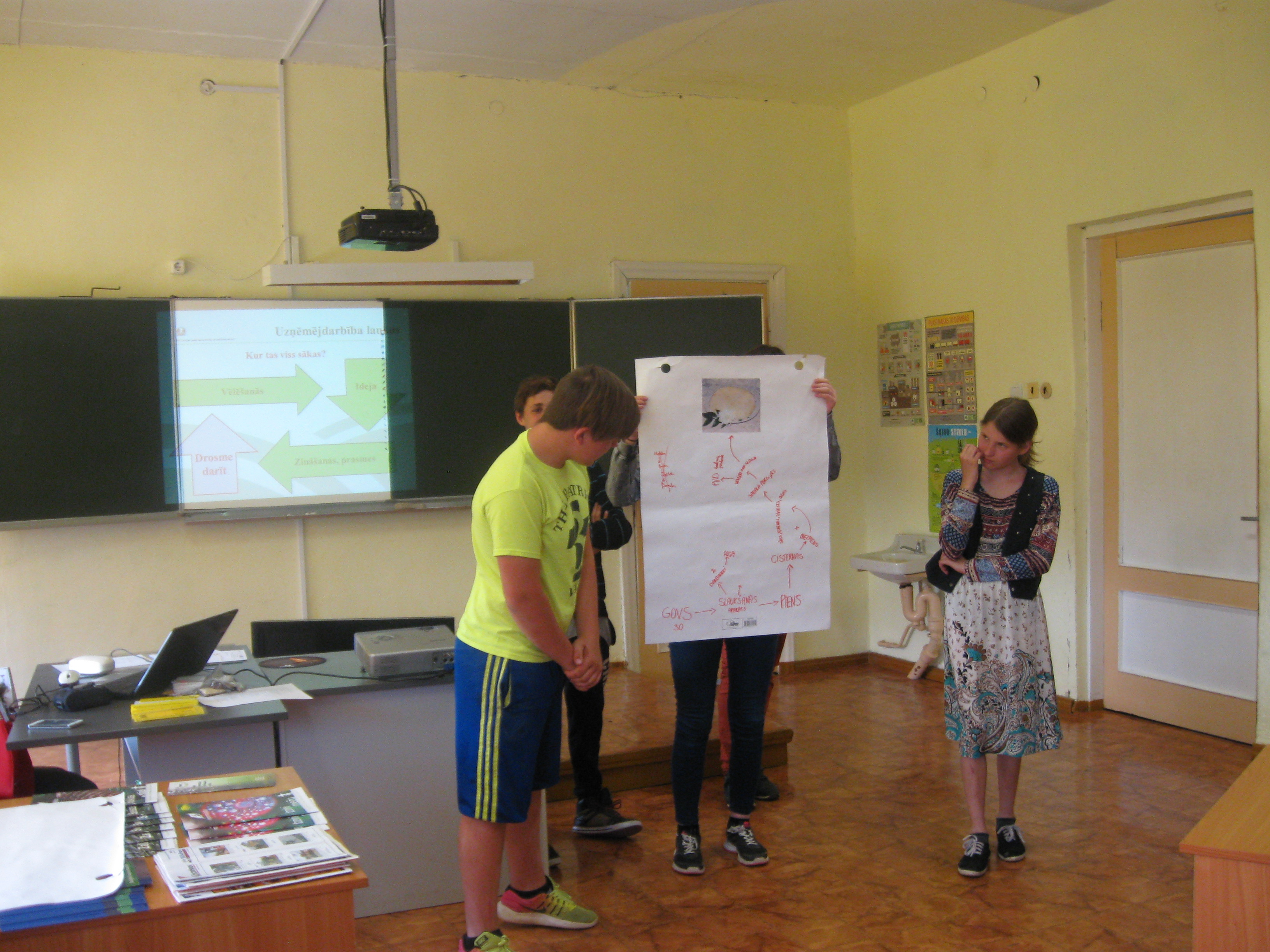 Tikšanās laikā demonstrējām prezentāciju un stāstījām par lauksaimniecības un mežsaimniecības nozarēm. Klausoties stāstīto, skolēni varēja rast atbildes uz krustvārdu mīklas jautājumiem. Tāpat visa pasākuma laikā tika uzdoti āķīgi jautājumi, kur par pareizām atbildēm varēja iegūt gardu Aizkraukles ražotāju balvu. Skolēniem patika darboties darba grupās, pildot uzdevumus par lauksaimniecības veidiem, pasākuma noslēgumā katra grupa kā mājražotāji cepa maizi un ražoja sieru, lai piedāvātu tirgū. Bērniem vajadzēja aprakstīt ražošanas procesu, sadarbību ar mājražotājus kontrolējošām iestādēm, un beigās pārstāvji no darba grupām prezentēja savu darbu.