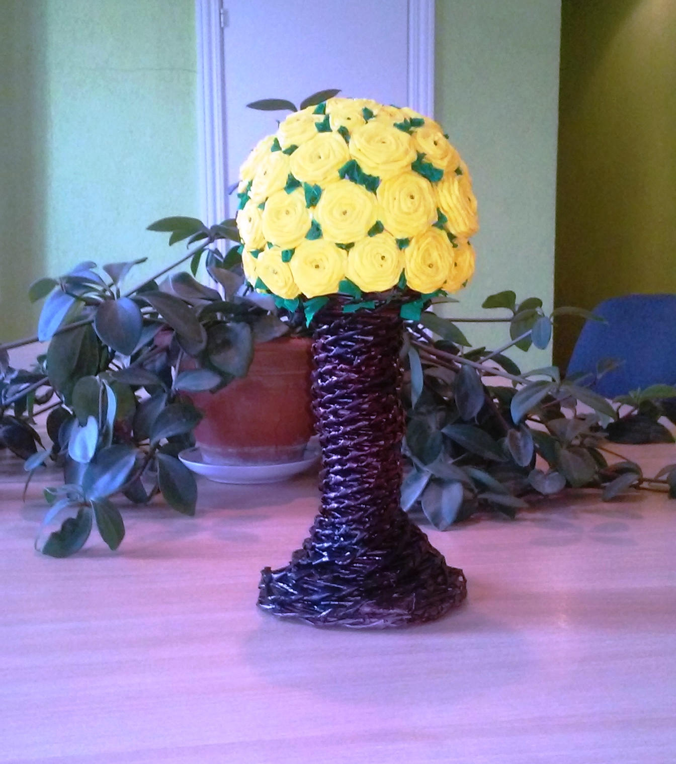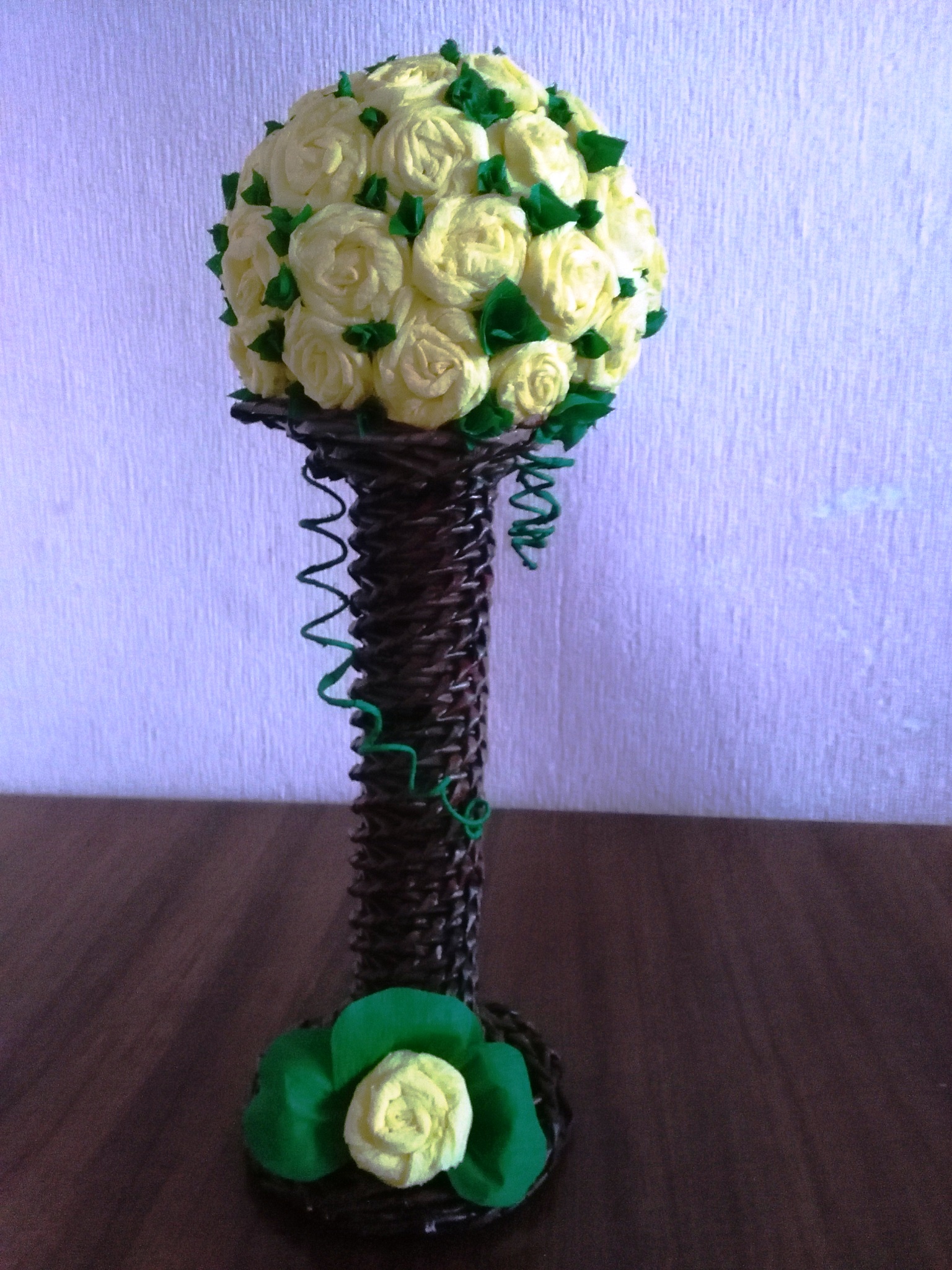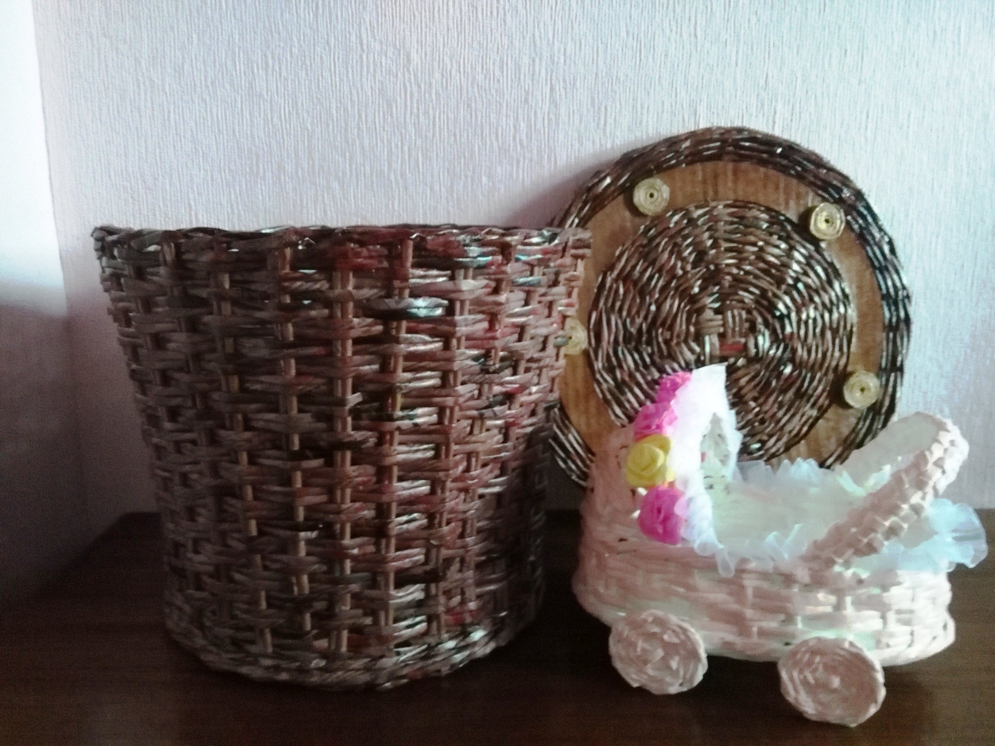 Sarunā ar Inesi sapratām, ka iespējas ir neizmērojamas šajos darinājumos – sākot no groziņiem, puķu pušķiem, kaķu mājiņām, maizes kastēm, lādītēm, dzīvnieciņiem, līdz pat bērnu ratiņiem, šūpulīšiem, portatīvo datoru apdarināšanai un citām skaistām lietām. Viņa spēj ne tikai uzpīt pamatu, bet pielikt nepieciešamos materiālus, lai būtu gatava dāvana. Arī Saldus birojs saņēma skaistu, pavasarīgu dāvanu – dzeltenu, spilgtu rožu pušķi no kreppapīra, kam klāt pīta vāze. Ineses acīs un runā ir degsme, ideju ir ļoti daudz. Mudinām Inesi piedalīties izstādē „Ražots Saldū” 28. martā, lai saldenieki un viesi varētu priecāties un iegādāties šos skaistos darinājumus.