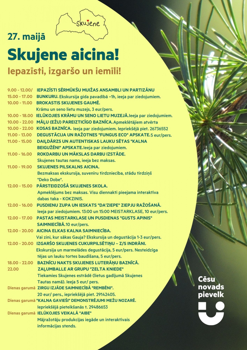 Skujenē ir ko redzēt un Skujenē ir ko baudīt, tāpēc 27. maijā, visas dienas garumā, gan novadnieki, gan tuvāki un tālāki viesi tiek aicināti uz Skujeni, uz vēl nebijušu notikumu, kad Skujene atver savas durvis un gaida ciemos ikvienu!