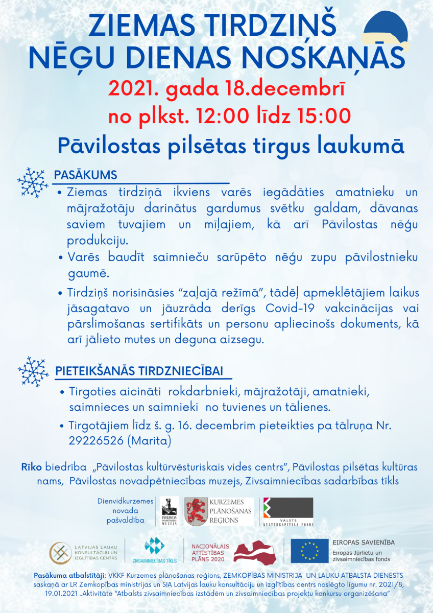 @ Ziemas tirdziņā ikviens varēs iegādāties amatnieku un mājražotāju darinātus gardumus svētku galdam, dāvanas saviem tuvajiem un mīļajiem, kā arī Pāvilostas nēģu produkciju.