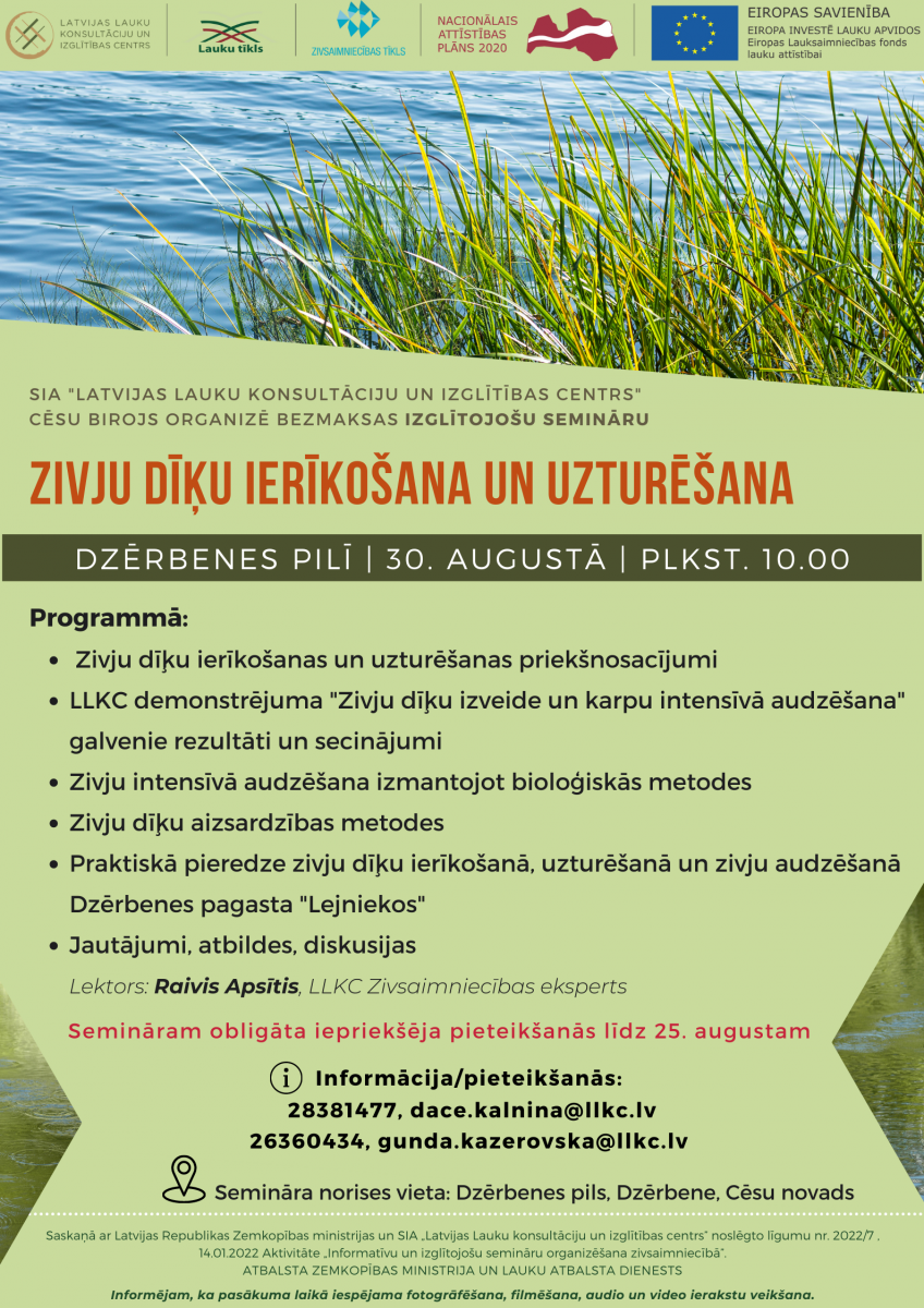 Seminārs tiek rīkots Saskaņā ar Latvijas Republikas Zemkopības ministrijas un SIA „Latvijas Lauku konsultāciju un izglītības centrs” noslēgto līgumu nr. 2022/7 , 14.01.2022 Aktivitāte „Informatīvu un izglītojošu semināru organizēšana zivsaimniecībā”.