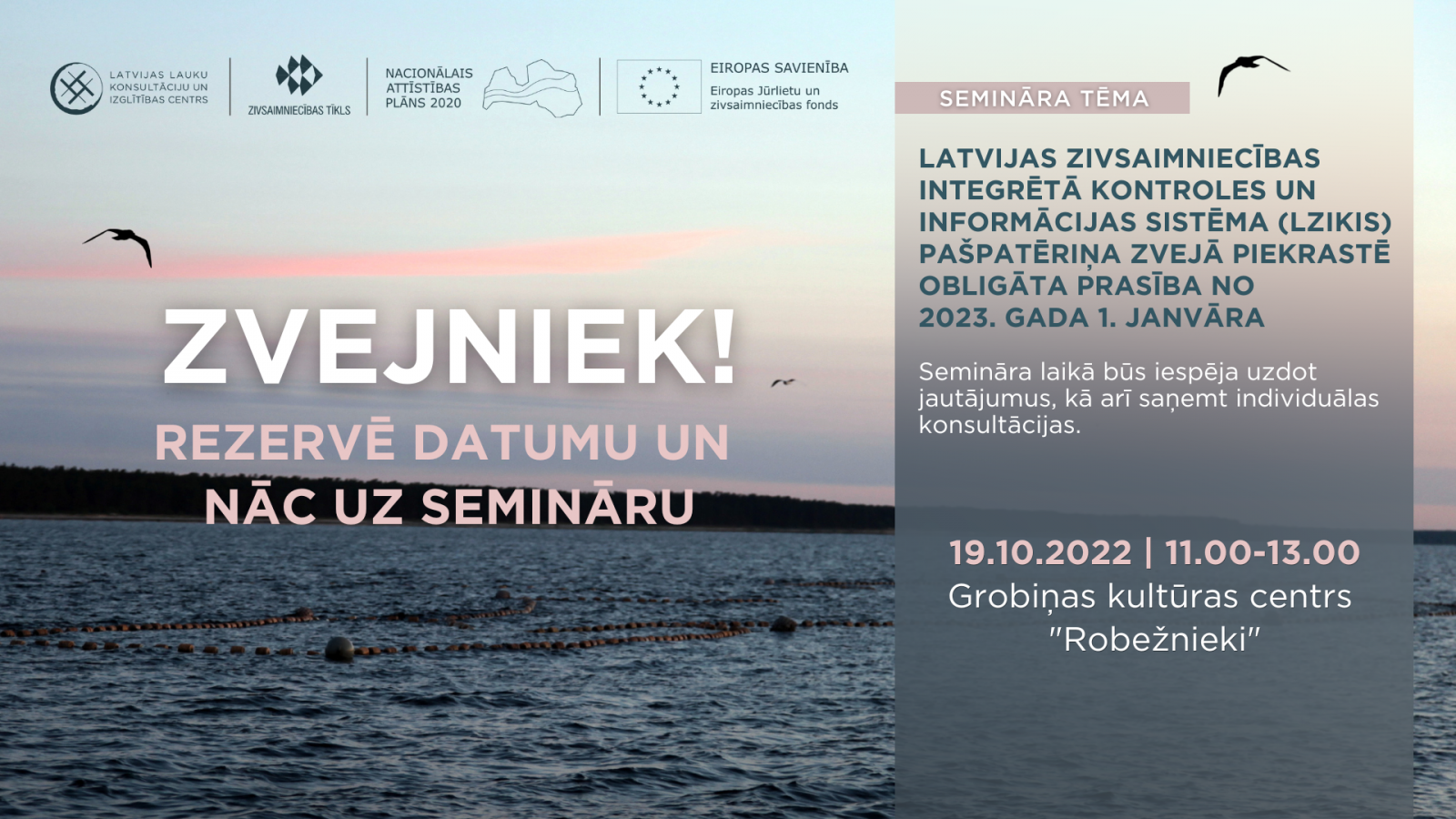 2022. gada 19. oktobrī plkst. 11:00 Grobiņas kultūras centrā "Robežnieki" (Liepu iela 1a, Grobiņas pagasts) informatīvais seminārs piekrastes pašpatēriņa zvejniekiem par Latvijas zivsaimniecības integrēto kontroles un informācijas sistēmu (LZIKIS).