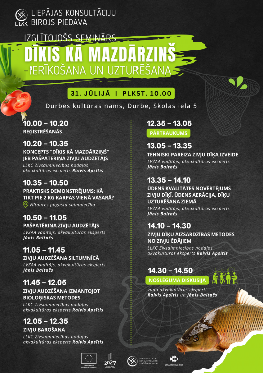 Pasākums īstenots saskaņā ar Latvijas Republikas Zemkopības ministrijas un SIA „Latvijas Lauku konsultāciju un izglītības centrs” noslēgto līgumu nr. 2023/133, 29.12.2023, aktivitāte „Informatīvu un izglītojošu semināru organizēšana zivsaimniecībā” ietvaros.