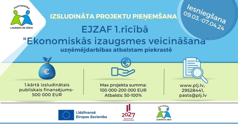 Biedrība “Partnerība laukiem un jūrai” izsludina atklāta konkursa projektu iesniegumu pieņemšanas 1. kārtu EJZAF 1. rīcībā “Ekonomiskās izaugsmes veicināšana”