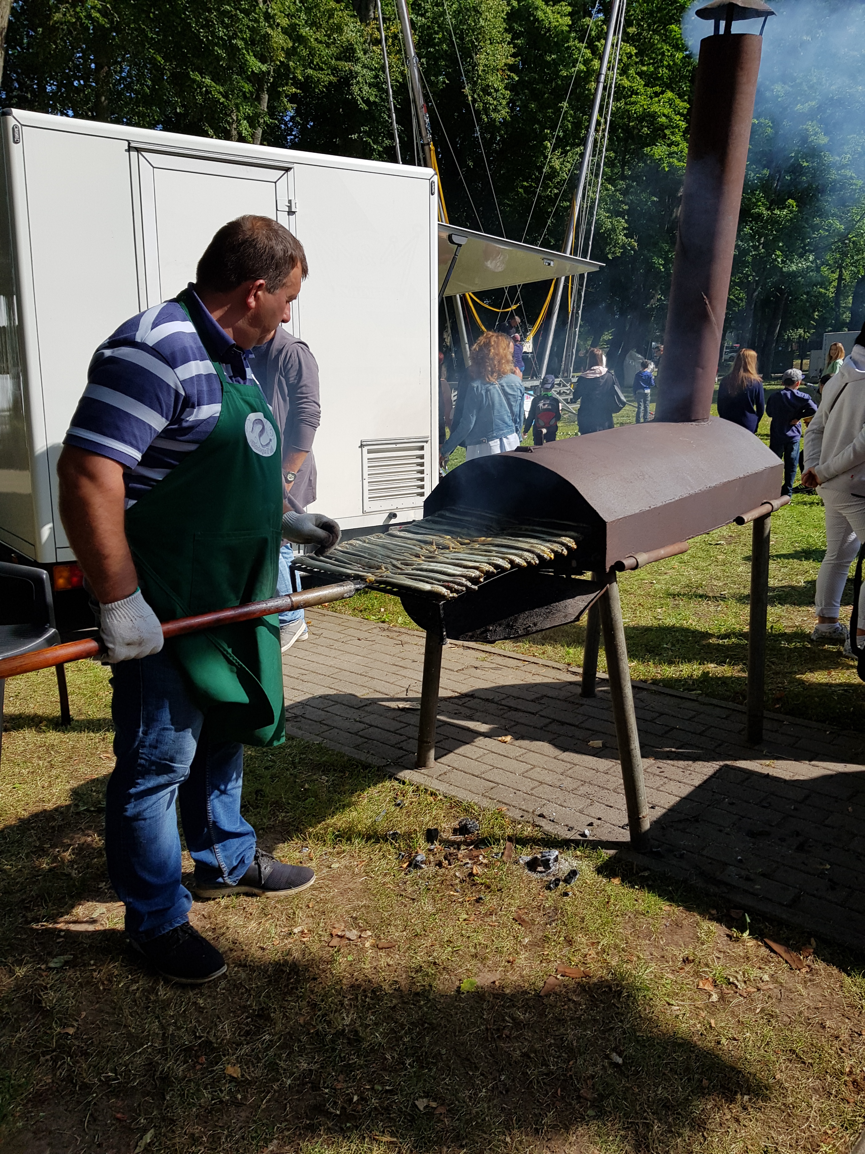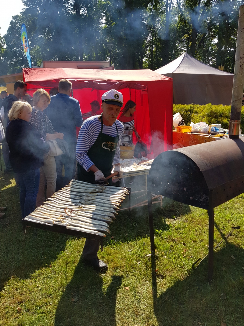 Šī gada svētku programma aicināja pabūt divās dažādu sajūtu ostās – Svētku ostā Carnikavas parkā un Miera ostā Gaujmalā. Sākot ar pirmo ostu, gar neskaitāmajiem drēbju, apavu un citiem amatnieku izstrādājumu stendiem dodos uz zivju placi, kur paredzēta nēģu cepšana un tirgošana. Te savas mobilās krāsnis kurina un nēģu cepamās restes cilā divi pārstrādes uzņēmumi – SIA “Zibs” un IK “Gundegas IP”. Uzsākot sarunu, pajautāju čaklajiem strādniekiem, kāds noskaņojums svētkos, kā sokas darbi?